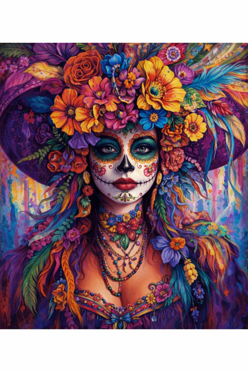 این طرح یک تصویر فانتزی و بسیار چشمنواز از چهرهی بانویی با آرایش هنری الهامگرفته از سبک Day of the Dead است. ترکیب جسورانهی رنگهای زنده، گلهای پرجزئیات، پرها و عناصر تزئینی، این اثر را به یکی از خاصترین طرحهای نقاشی با اعداد تبدیل کرده است.