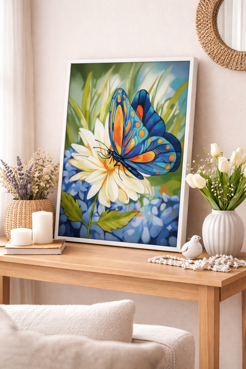 نقاشی با اعداد طرح پروانهی رنگارنگ روی گل سفید، تصویری لطیف و آرامشبخش از طبیعت را به نمایش میگذارد. ترکیب رنگهای آبی، نارنجی و زرد در بالهای پروانه در کنار گلهای ظریف و پسزمینهی سبز، حس طراوت، زندگی و زیبایی طبیعی را به فضا منتقل میکند.