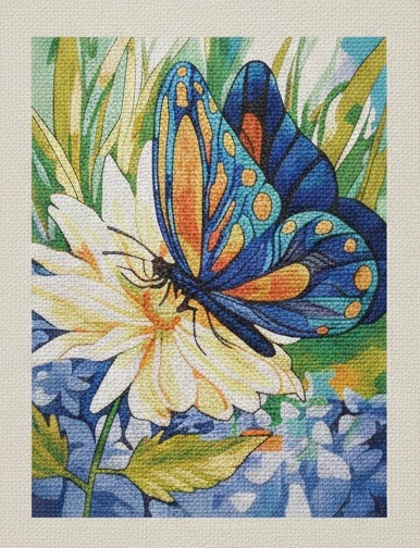 نقاشی با اعداد طرح پروانهی رنگارنگ روی گل سفید، تصویری لطیف و آرامشبخش از طبیعت را به نمایش میگذارد. ترکیب رنگهای آبی، نارنجی و زرد در بالهای پروانه در کنار گلهای ظریف و پسزمینهی سبز، حس طراوت، زندگی و زیبایی طبیعی را به فضا منتقل میکند.