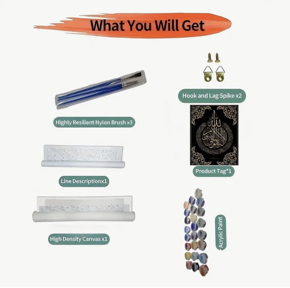 شامل:: طرح چاپشده با شمارهبندی دقیق، رنگهای اکریلیک باکیفیت، 3عدد قلم مو، گیره و یراق نصب روی دیوار