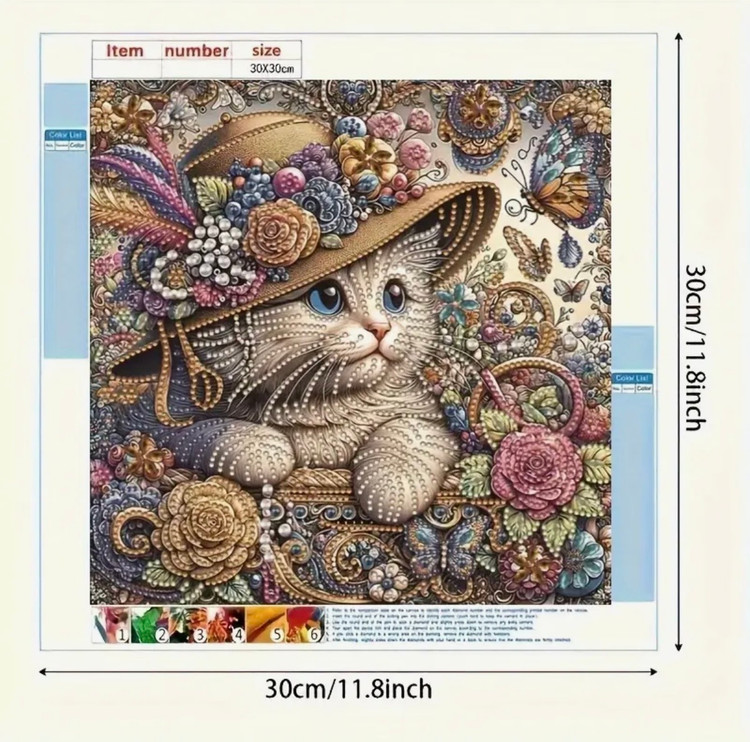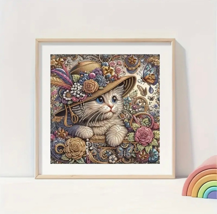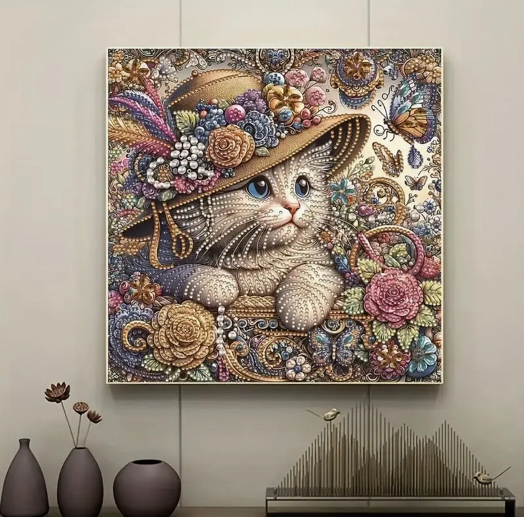 این نقاشی جواهریه تصویری بسیار خاص و فانتزی از گربهای اشرافی با کلاه گلدار و تزئینات فاخر را به نمایش میگذارد. در این اثر، جزئیات با استفاده از جواهرات برجسته، نگینها و مرواریدهای براق اجرا شدهاند که جلوهای سهبعدی و فوقالعاده لوکس به تابلو میبخشند.
