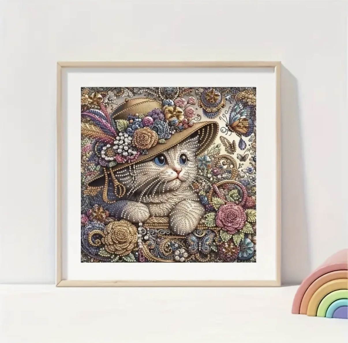 این نقاشی جواهریه تصویری بسیار خاص و فانتزی از گربهای اشرافی با کلاه گلدار و تزئینات فاخر را به نمایش میگذارد. در این اثر، جزئیات با استفاده از جواهرات برجسته، نگینها و مرواریدهای براق اجرا شدهاند که جلوهای سهبعدی و فوقالعاده لوکس به تابلو میبخشند.