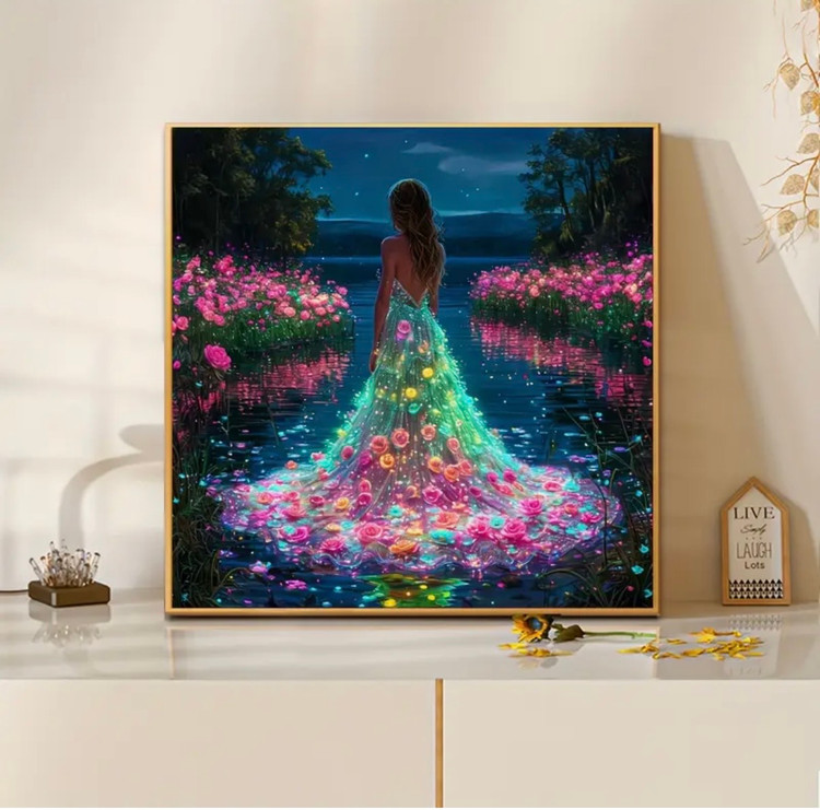 این نقاشی الماسیه با الماسهای مربعی اجرا میشود که بهدلیل چیدمان دقیق و منظم، جزئیات طرح را با وضوحی خیرهکننده نمایش میدهند. تصویر بانویی در لباس درخشان میان دریاچهای آرام و گلهای نورانی، حس آرامش، رویا و لطافت زنانه را منتقل میکند.