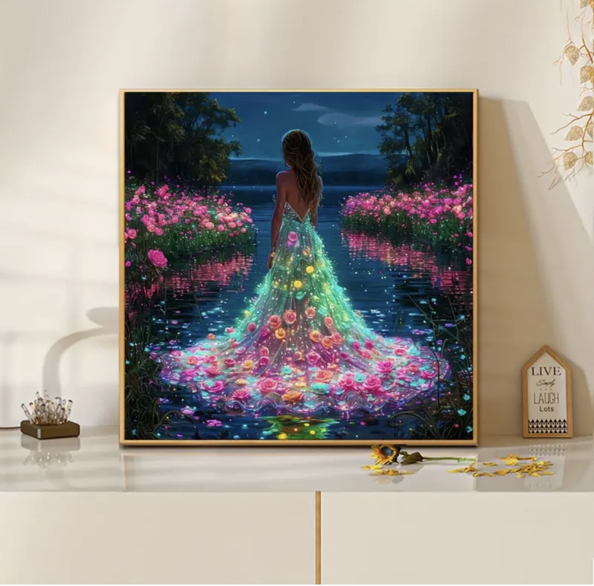 این نقاشی الماسیه با الماسهای مربعی اجرا میشود که بهدلیل چیدمان دقیق و منظم، جزئیات طرح را با وضوحی خیرهکننده نمایش میدهند. تصویر بانویی در لباس درخشان میان دریاچهای آرام و گلهای نورانی، حس آرامش، رویا و لطافت زنانه را منتقل میکند.