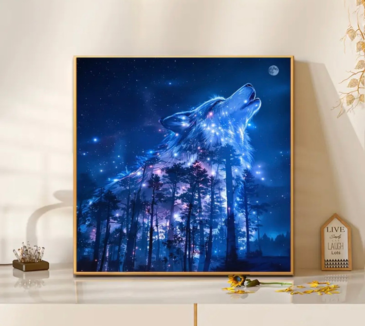 الماسهای مربعی با پوشش کامل سطح تابلو، باعث میشوند نقاط نورانی و ستارهگون روی بدن گرگ و فضای شب، شفافتر، یکدستتر و درخشانتر دیده شوند و جلوهای حرفهای و چشمگیر ایجاد کنند.