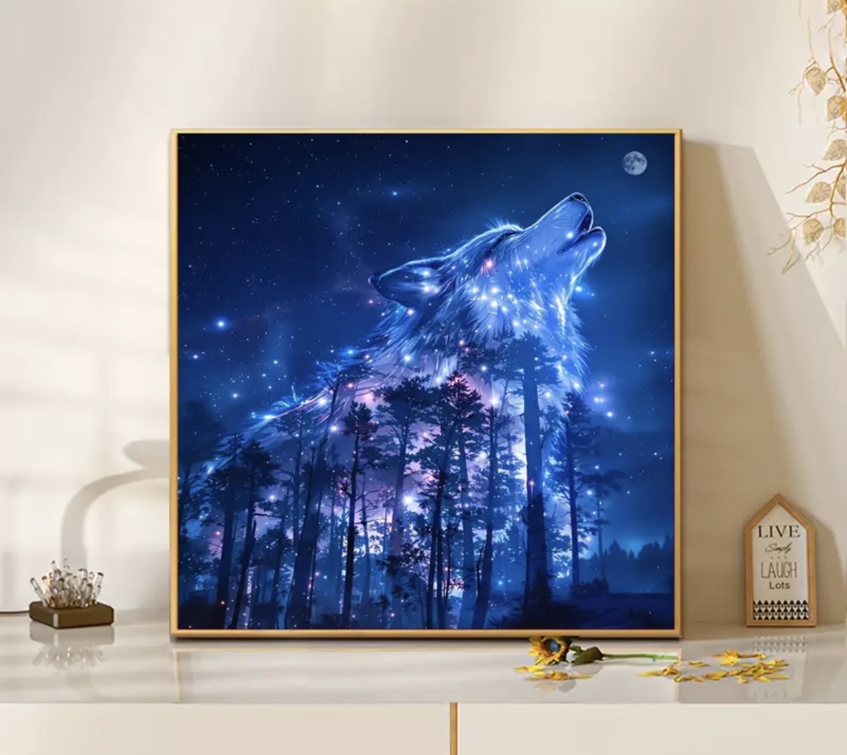 این نقاشی الماسیه با الماسهای مربعی اجرا میشود که بهدلیل چیدمان دقیق و منظم، جزئیات تصویر را با وضوح بسیار بالا نمایش میدهند. تصویر گرگی که زیر نور ماه در دل جنگل شبانه زوزه میکشد، نمادی از قدرت، آزادی، شجاعت و روح مستقل است.