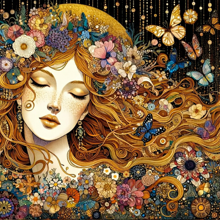 جزئیات ظریف گلها، پروانهها و بافت موها با درخشش الماسها جلوهای زنده و چشمنواز به تابلو میبخشند. پسزمینهی تیره باعث میشود رنگهای گرم و طلایی چهره و گلها بیشتر بدرخشند و اثر به نقطهی کانونی هر فضا تبدیل شود.