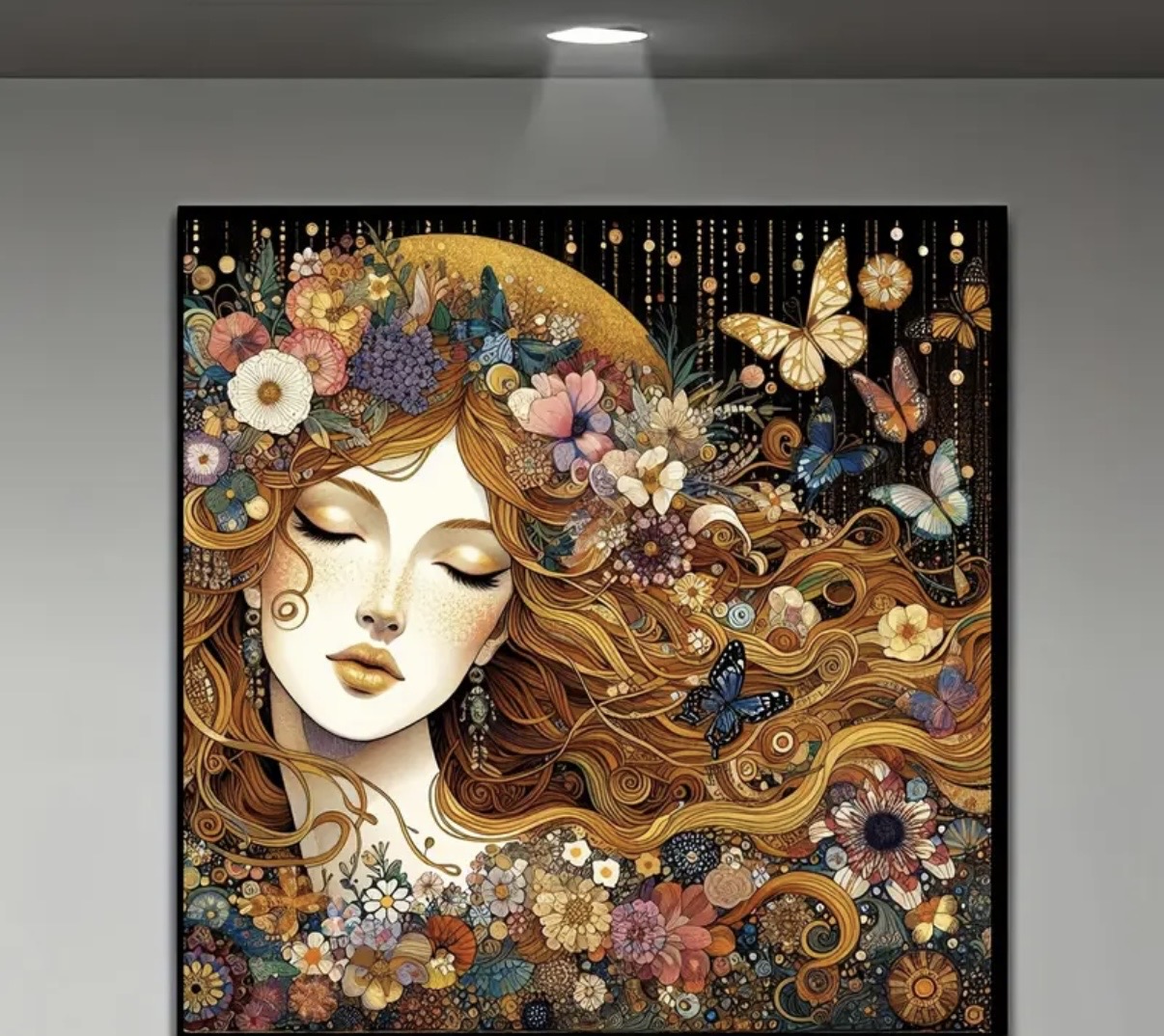 جزئیات ظریف گلها، پروانهها و بافت موها با درخشش الماسها جلوهای زنده و چشمنواز به تابلو میبخشند. پسزمینهی تیره باعث میشود رنگهای گرم و طلایی چهره و گلها بیشتر بدرخشند و اثر به نقطهی کانونی هر فضا تبدیل شود.