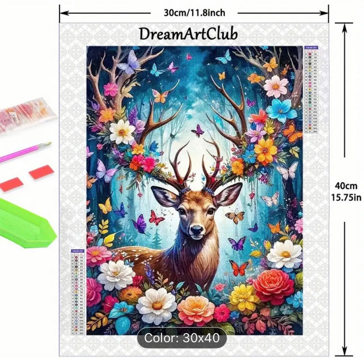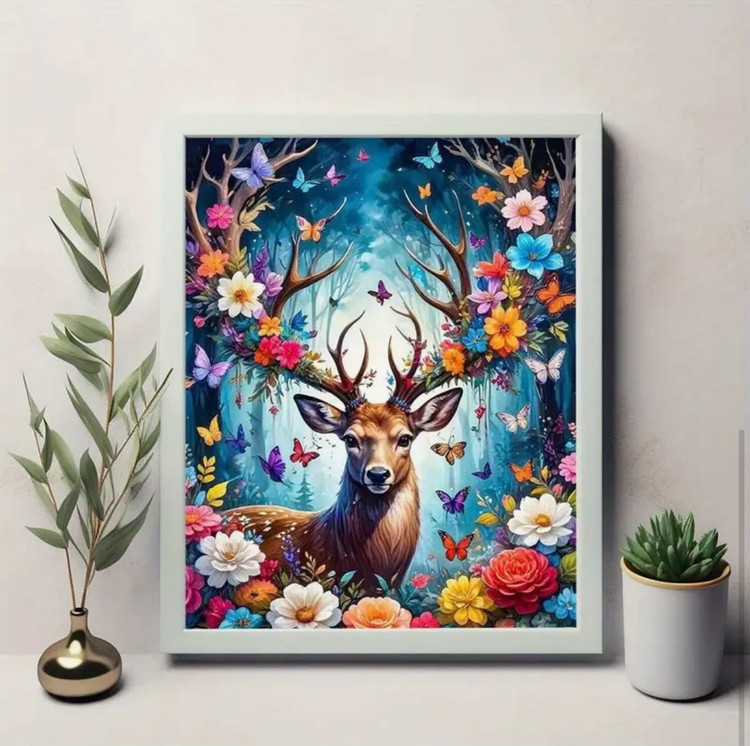 این نقاشی الماسیه تصویری دلنشین و الهامبخش از گوزنی باشکوه در دل جنگلی سرسبز و پر از گلهای رنگارنگ و پروانهها را به نمایش میگذارد. گوزن بهعنوان نماد قدرت، نجابت و تعادل در طبیعت شناخته میشود و حضور او در میان گلها و رنگهای شاد، حس آرامش، امید و انرژی مثبت را به فضا منتقل میکند.