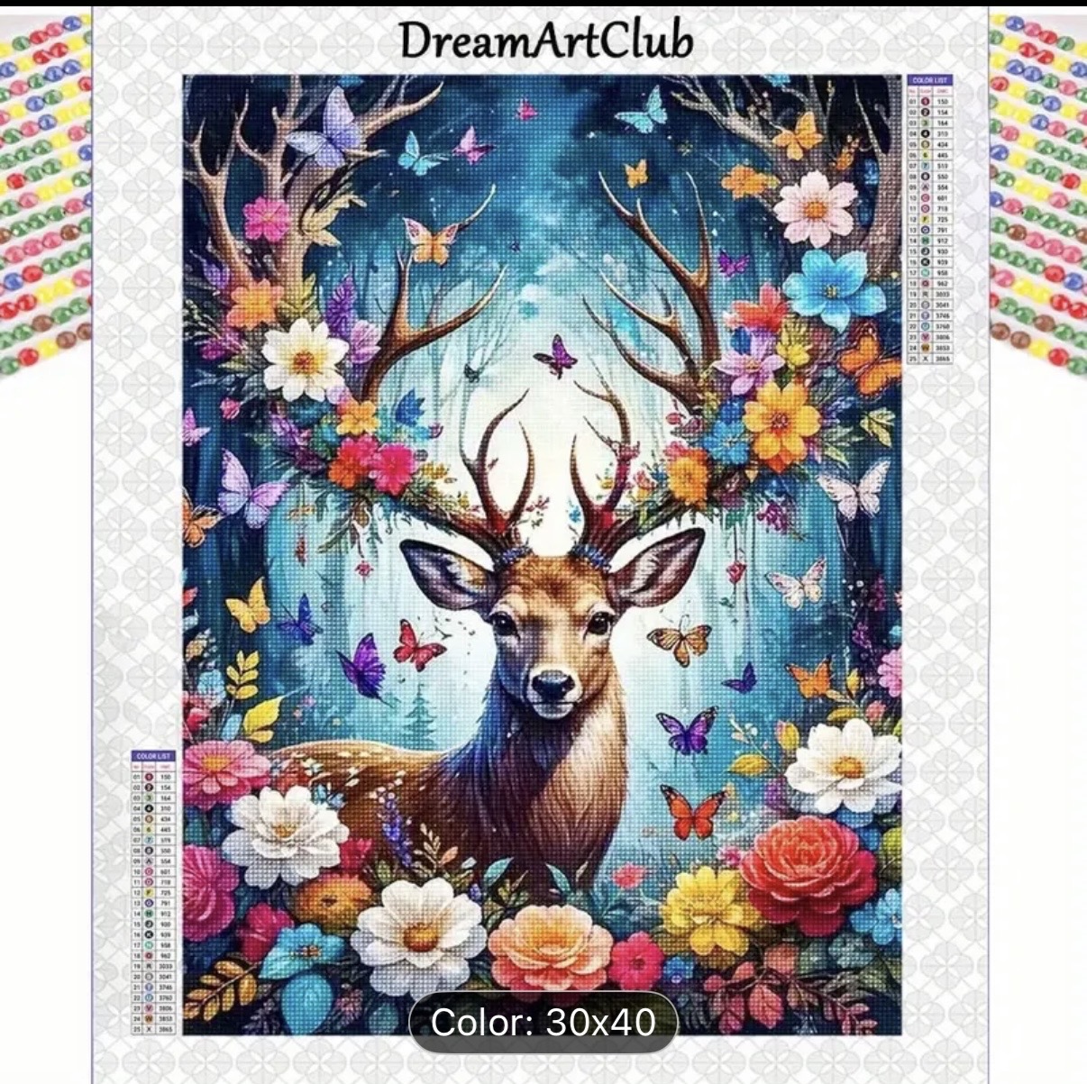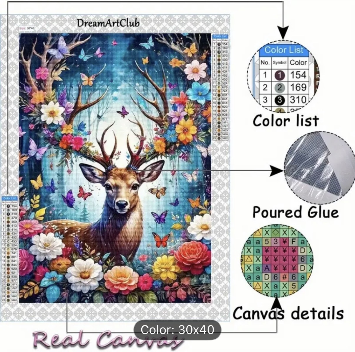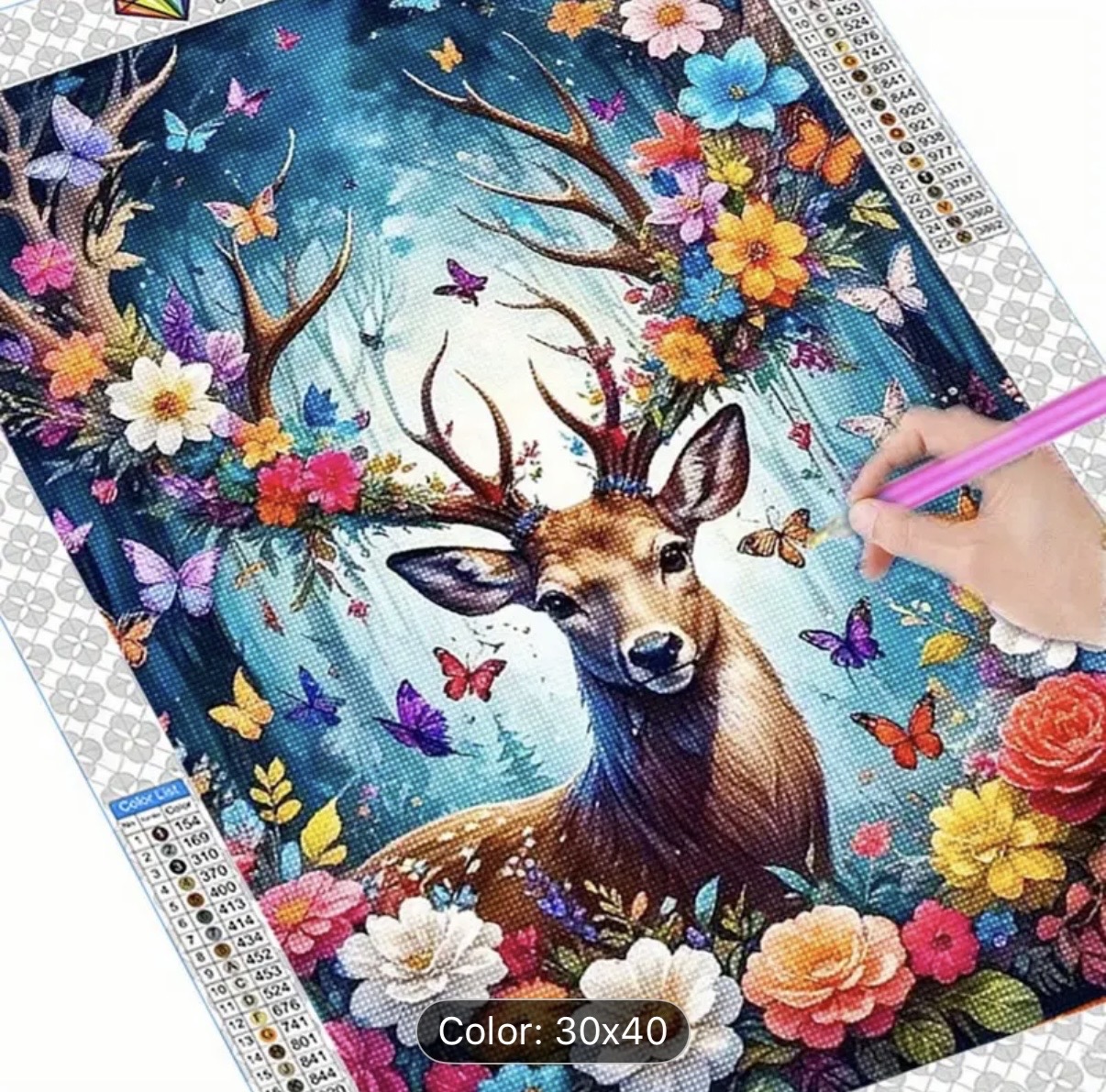 این نقاشی الماسیه تصویری دلنشین و الهامبخش از گوزنی باشکوه در دل جنگلی سرسبز و پر از گلهای رنگارنگ و پروانهها را به نمایش میگذارد. گوزن بهعنوان نماد قدرت، نجابت و تعادل در طبیعت شناخته میشود و حضور او در میان گلها و رنگهای شاد، حس آرامش، امید و انرژی مثبت را به فضا منتقل میکند.
