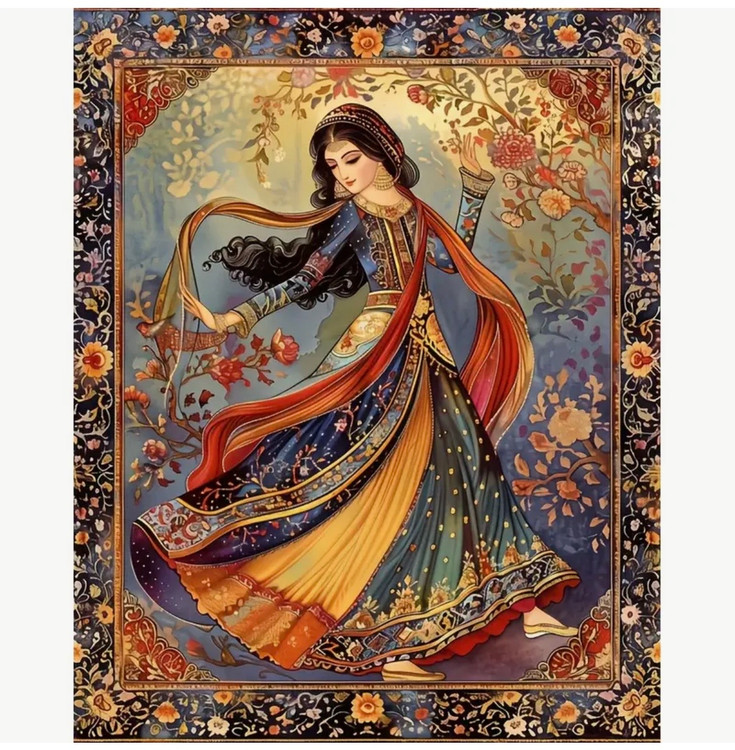 این نقاشی الماسیه تصویری شاعرانه از بانویی با پوشش سنتی ایرانی را به نمایش میگذارد که در حال رقصی نرم و موزون میان گلها و نقوش اسلیمی است. ترکیب لباسهای رنگارنگ، پارچههای روان و پسزمینهی گلدار، حس زندگی، لطافت و اصالت هنر ایرانی را به زیبایی منتقل میکند.