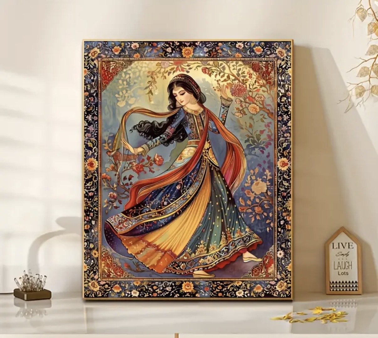 این نقاشی الماسیه تصویری شاعرانه از بانویی با پوشش سنتی ایرانی را به نمایش میگذارد که در حال رقصی نرم و موزون میان گلها و نقوش اسلیمی است. ترکیب لباسهای رنگارنگ، پارچههای روان و پسزمینهی گلدار، حس زندگی، لطافت و اصالت هنر ایرانی را به زیبایی منتقل میکند.