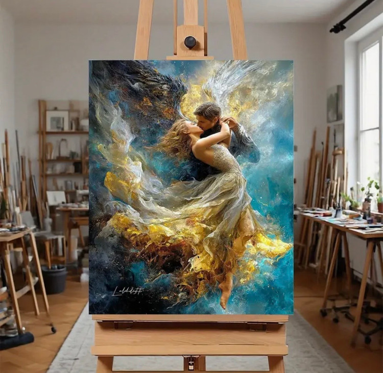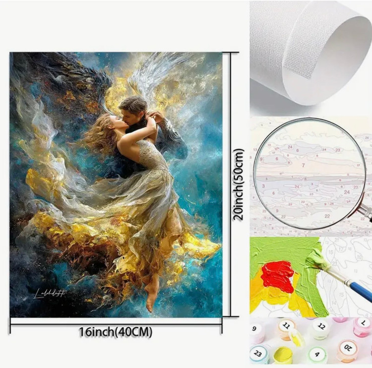 این تصویر یک نقاشی با اعداد با طرح عاشقانه و هنری است که یک زوج را در حال رقص و در آغوش هم نشان میدهد. ترکیب رنگهای گرم (طلایی و زرد) با رنگهای سرد (آبی و فیروزهای) حس عشق، حرکت و احساس را بهخوبی منتقل میکند.