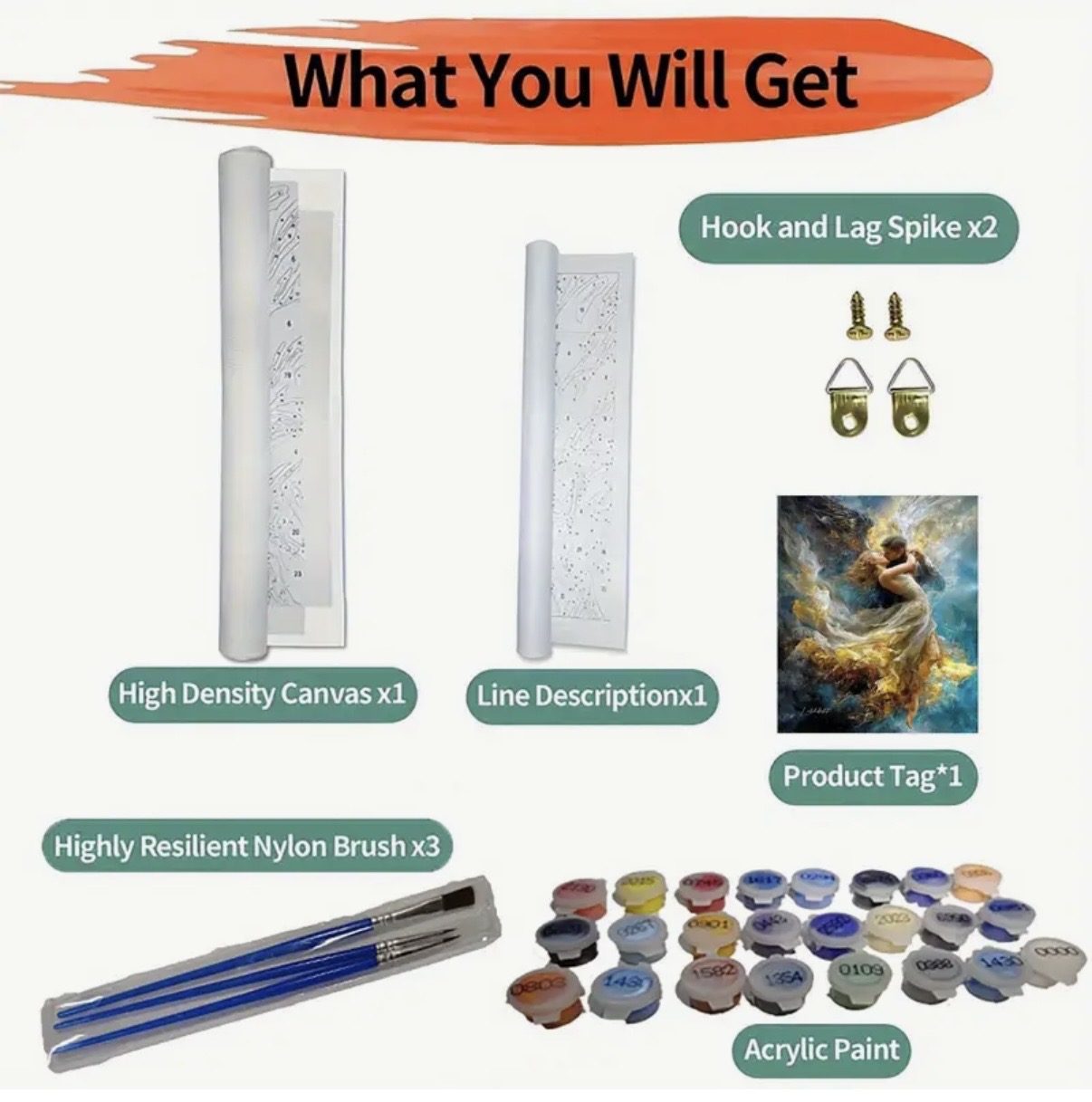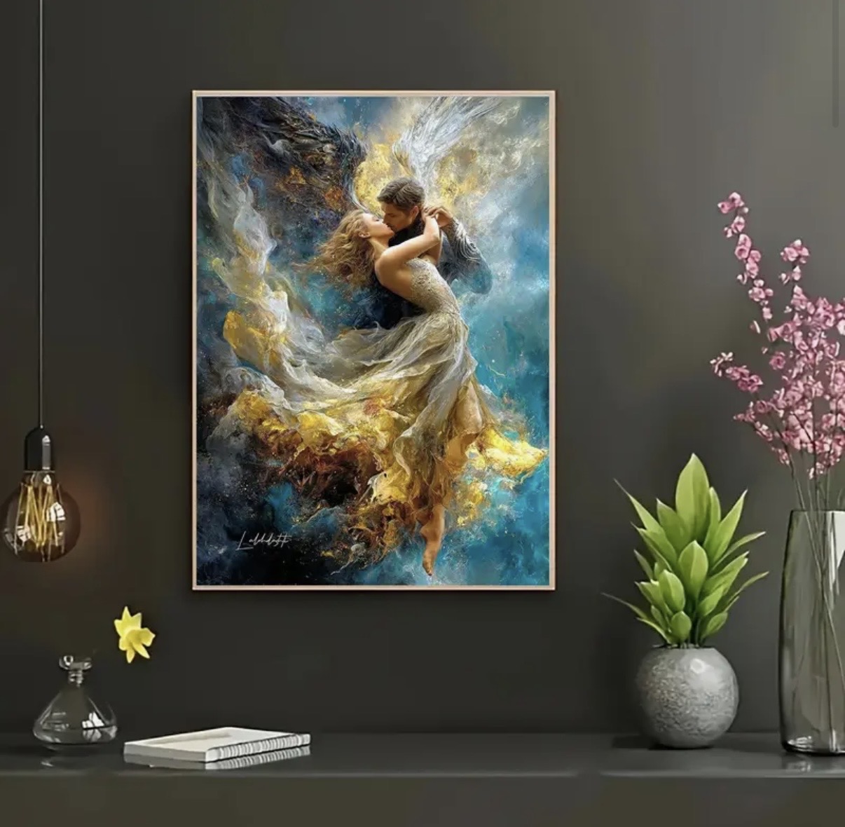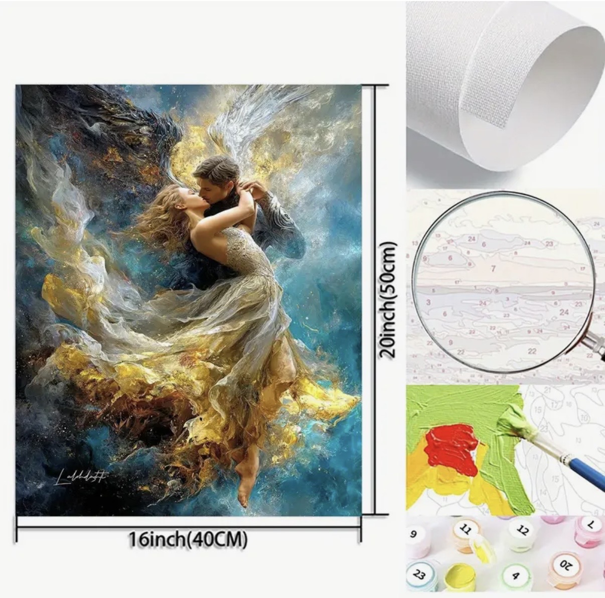 این تصویر یک نقاشی با اعداد با طرح عاشقانه و هنری است که یک زوج را در حال رقص و در آغوش هم نشان میدهد. ترکیب رنگهای گرم (طلایی و زرد) با رنگهای سرد (آبی و فیروزهای) حس عشق، حرکت و احساس را بهخوبی منتقل میکند.