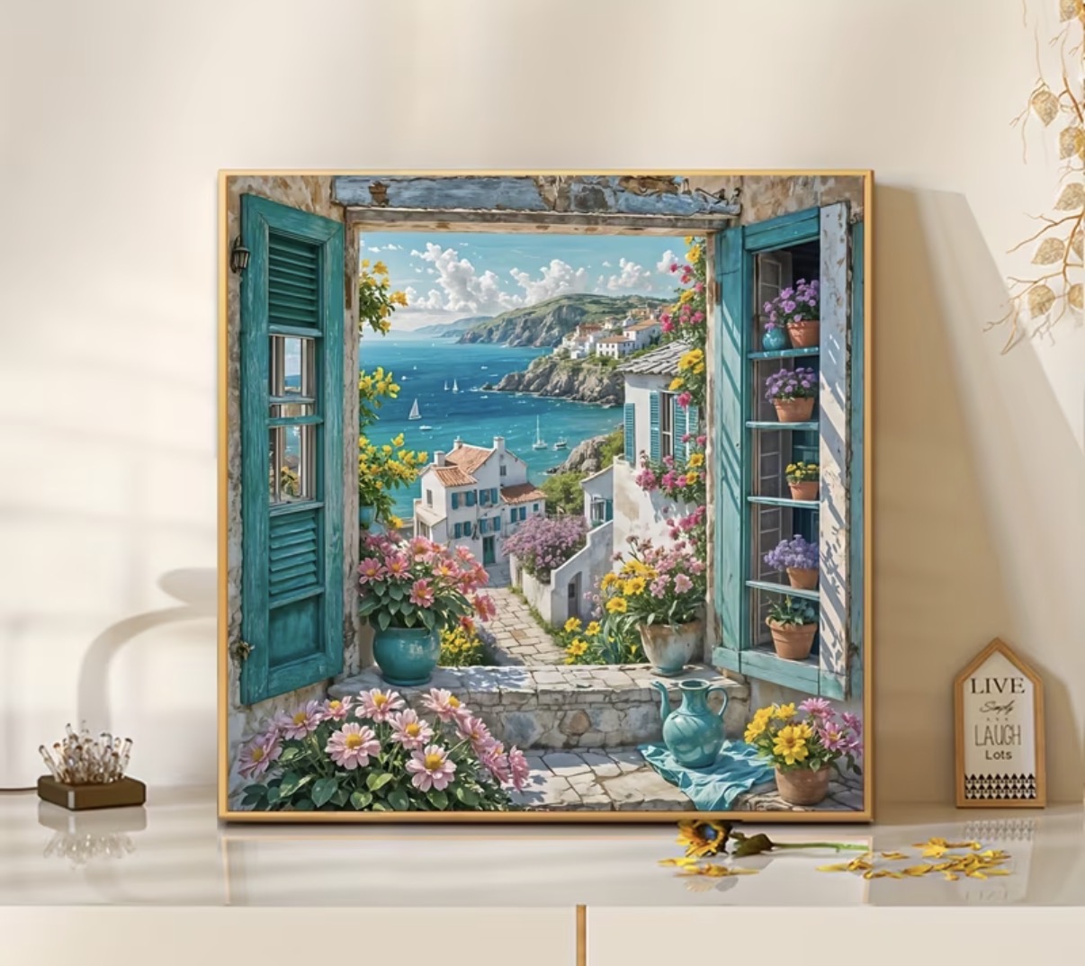 این نقاشی الماسی تصویری دلنشین از یک منظرهی ساحلی مدیترانهای را به نمایش میگذارد که از قاب یک پنجرهی قدیمی با درهای فیروزهای دیده میشود. خانههای سفید پلکانی، دریای آبی شفاف، قایقهای کوچک و گلهای رنگارنگ، صحنهای سرشار از آرامش و زندگی را خلق کردهاند.