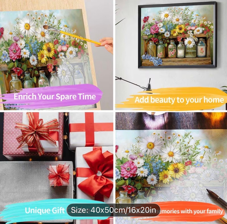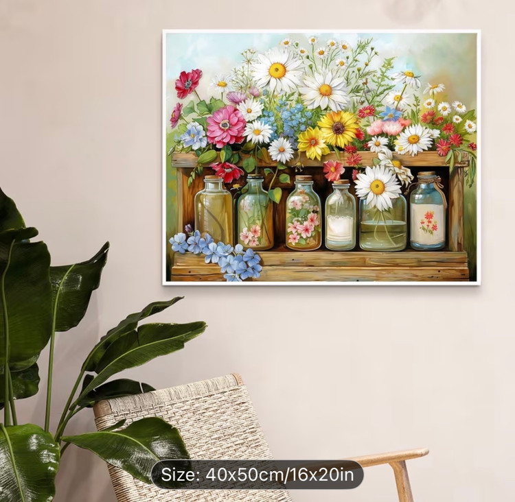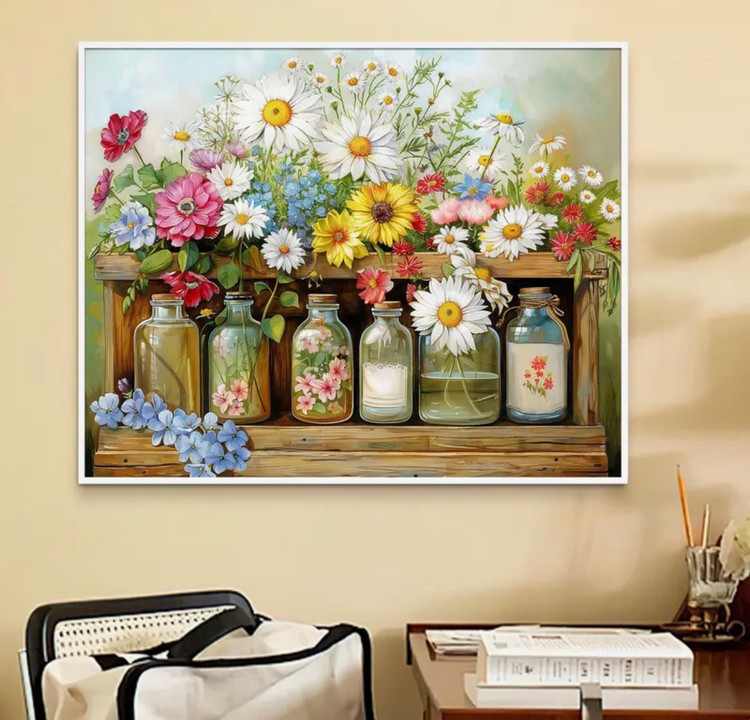 پسزمینهی ملایم و روشن باعث میشود رنگ گلها جلوهی بیشتری داشته باشند و تصویر نهایی بسیار دلنشین و زنده به نظر برسد. جزئیات گلبرگها، برگها و شیشهها بهصورت واضح اما قابلکنترل طراحی شدهاند تا در قالب نقاشی با اعداد، رنگآمیزی آن روان، لذتبخش و بدون پیچیدگی باشد.