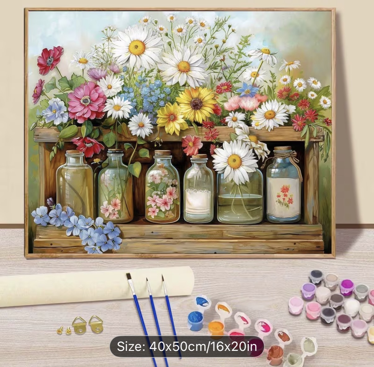 طرح چاپشده با شمارهبندی دقیق، رنگهای اکریلیک باکیفیت، 3عدد قلم مو، گیره و یراق نصب روی دیوار