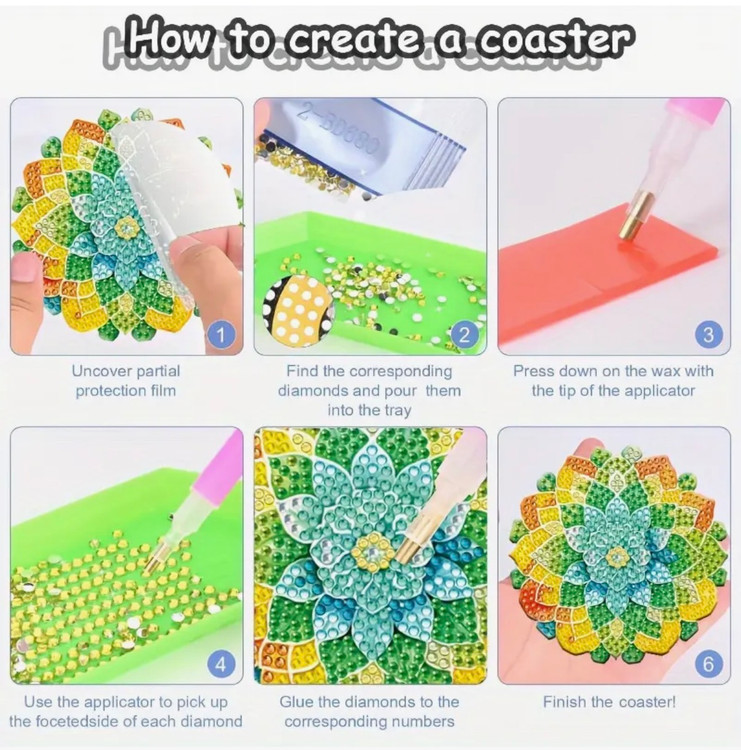 در این محصول، هر قسمت از طرح با رنگ مشخصی علامتگذاری شده و شما با قرار دادن سنگهای الماسی در جای درست، طرح را کامل میکنید. نتیجهی نهایی علاوه بر جنبهی هنری، کاملاً قابل استفاده روزمره بوده و از سطح میز در برابر حرارت و رطوبت لیوان محافظت میکند.