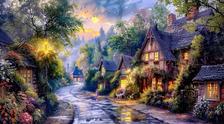جاده سنگفرش خیس که در میان خانهها امتداد دارد، بازتاب نور آسمان و چراغها را در خود گرفته و فضای تصویر را شاعرانه و زنده کرده است. آسمان غروب با ترکیب رنگهای بنفش، صورتی و طلایی، حالوهوایی رؤیایی به کل صحنه میبخشد و حضور پرندگان در آسمان، حس زندگی و حرکت را تقویت میکند.