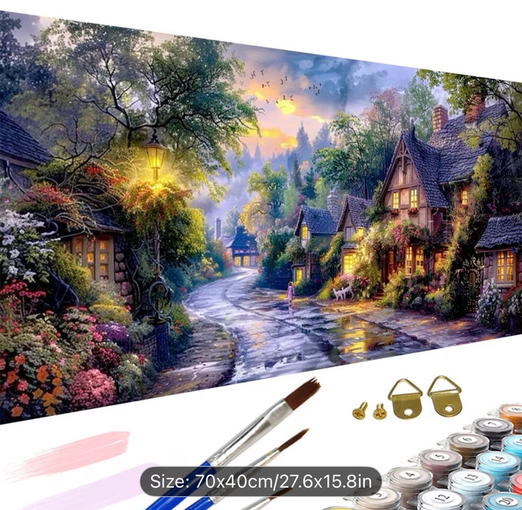 این طرح نقاشی با اعداد، منظرهای رویایی و آرام از یک روستای جنگلی را به تصویر میکشد. کلبههای چوبی با سقفهای شیروانی، در میان درختان سرسبز و گلهای رنگارنگ قرار گرفتهاند و نور گرم چراغها از پنجرهها، حس صمیمیت و آرامش را منتقل میکند.