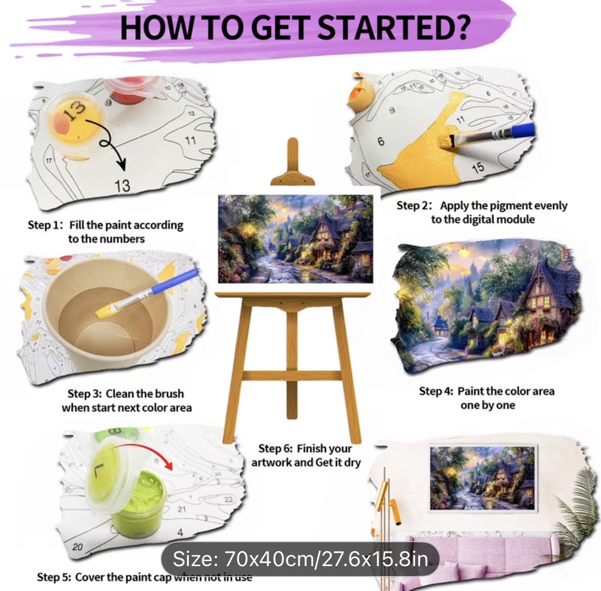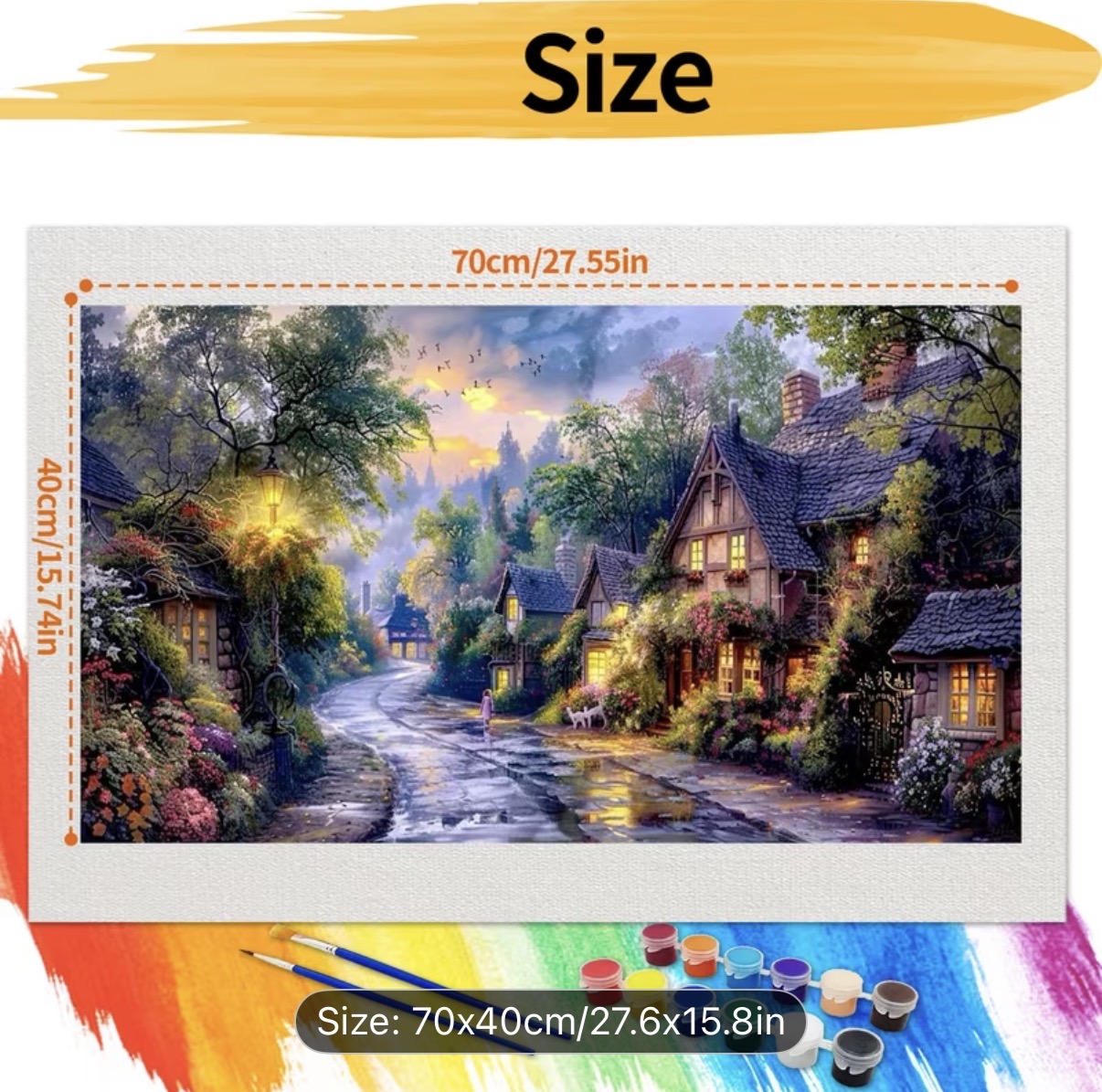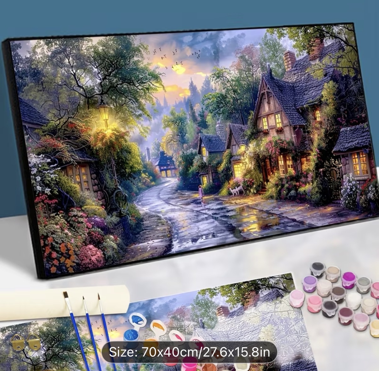 این طرح نقاشی با اعداد، منظرهای رویایی و آرام از یک روستای جنگلی را به تصویر میکشد. کلبههای چوبی با سقفهای شیروانی، در میان درختان سرسبز و گلهای رنگارنگ قرار گرفتهاند و نور گرم چراغها از پنجرهها، حس صمیمیت و آرامش را منتقل میکند.