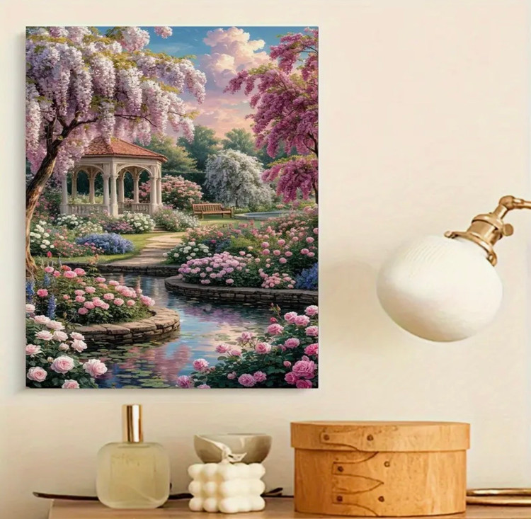 این طرح نقاشی با اعداد، صحنهای آرام، لطیف و کاملاً رؤیایی از یک باغ کلاسیک را به تصویر میکشد. آلاچیق سفید با ستونهای ظریف در قلب باغ قرار گرفته و با گلهای شکوفهدار صورتی و بنفش احاطه شده است؛ فضایی که حس آرامش، عشق به طبیعت و سکوت دلنشین را القا میکند.