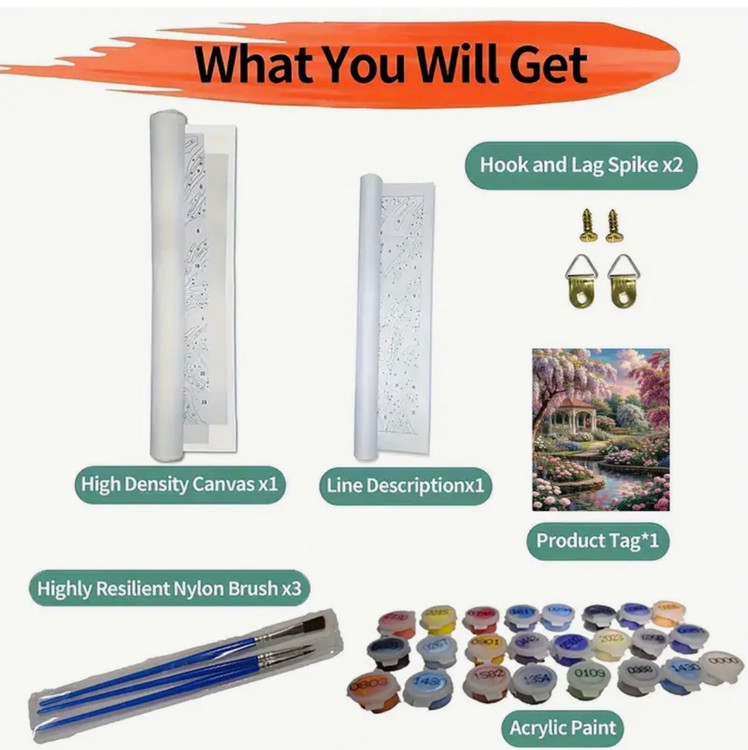 طرح چاپشده با شمارهبندی دقیق، رنگهای اکریلیک باکیفیت، 3عدد قلم مو، گیره و یراق نصب روی دیوار