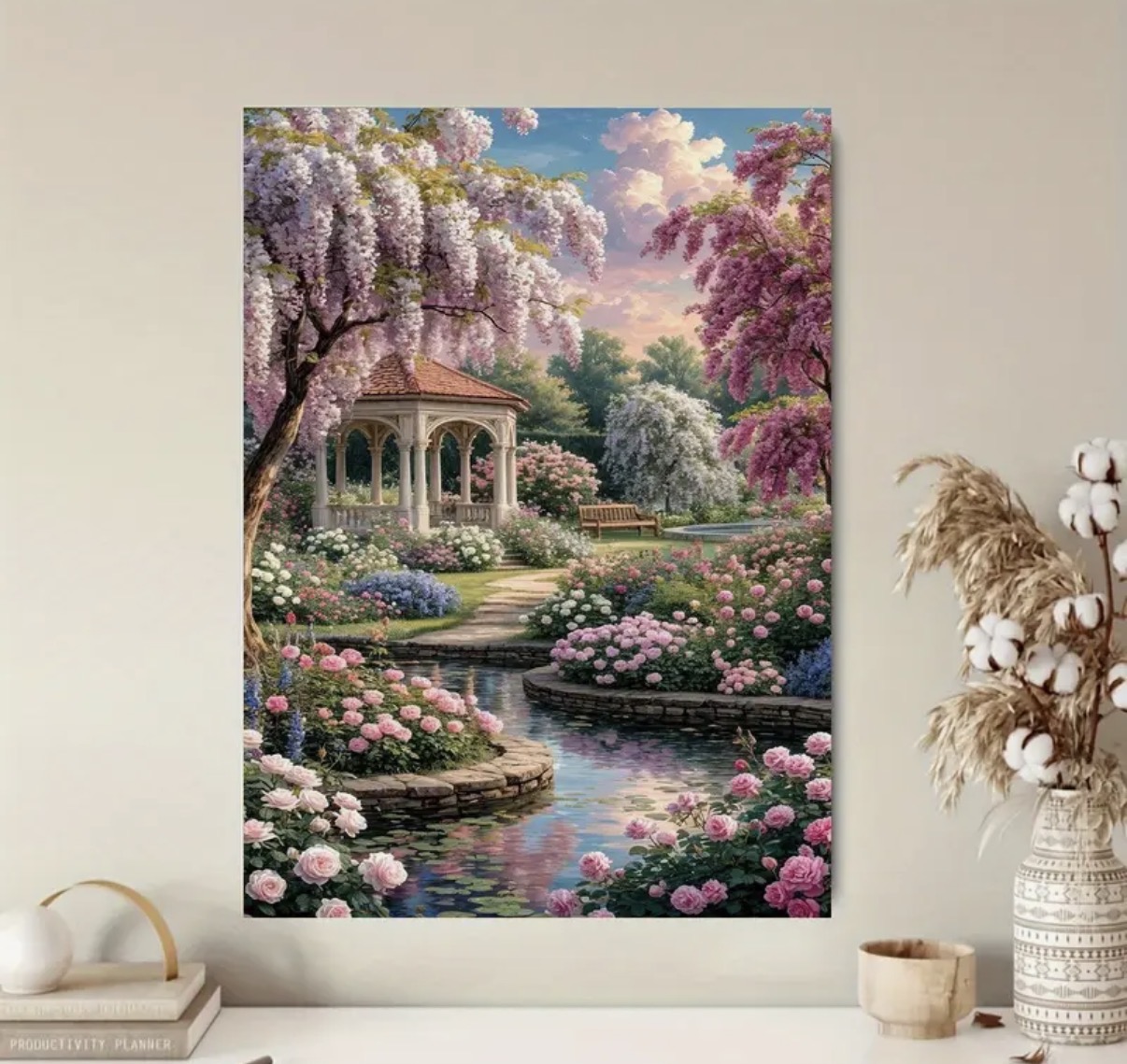 این طرح نقاشی با اعداد، صحنهای آرام، لطیف و کاملاً رؤیایی از یک باغ کلاسیک را به تصویر میکشد. آلاچیق سفید با ستونهای ظریف در قلب باغ قرار گرفته و با گلهای شکوفهدار صورتی و بنفش احاطه شده است؛ فضایی که حس آرامش، عشق به طبیعت و سکوت دلنشین را القا میکند.