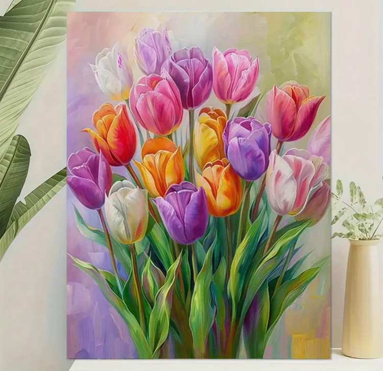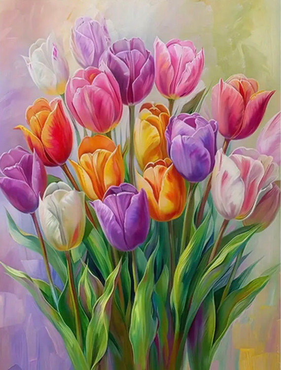 این طرح تصویری لطیف و سرزنده از دستهای لالههای بهاری را نشان میدهد که با ترکیبی هماهنگ از رنگهای صورتی، بنفش، نارنجی، زرد و سفید در کنار هم قرار گرفتهاند. گلها با ساقهها و برگهای سبز زنده، حس طراوت و تازگی طبیعت را بهخوبی منتقل میکنند.