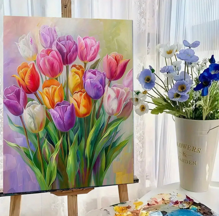 پسزمینهی نقاشی با رنگهای ملایم و محو طراحی شده تا تمرکز اصلی روی گلها باقی بماند و جلوهای آرام، روشن و دلنشین ایجاد شود. ترکیب رنگها شاد اما متعادل است و فضایی گرم و مثبت به تصویر میدهد.