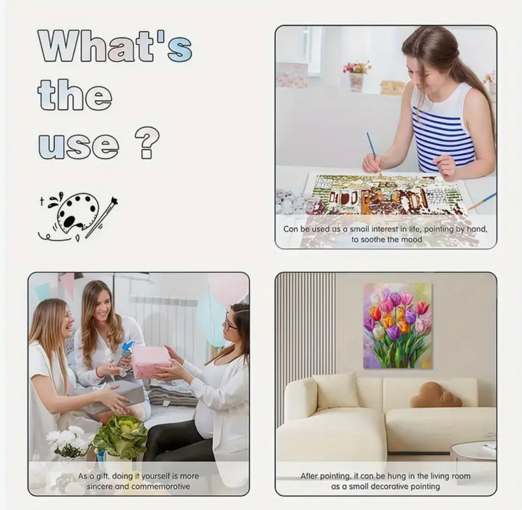 طرح چاپشده با شمارهبندی دقیق، رنگهای اکریلیک باکیفیت، 3عدد قلم مو، گیره و یراق نصب روی دیوار