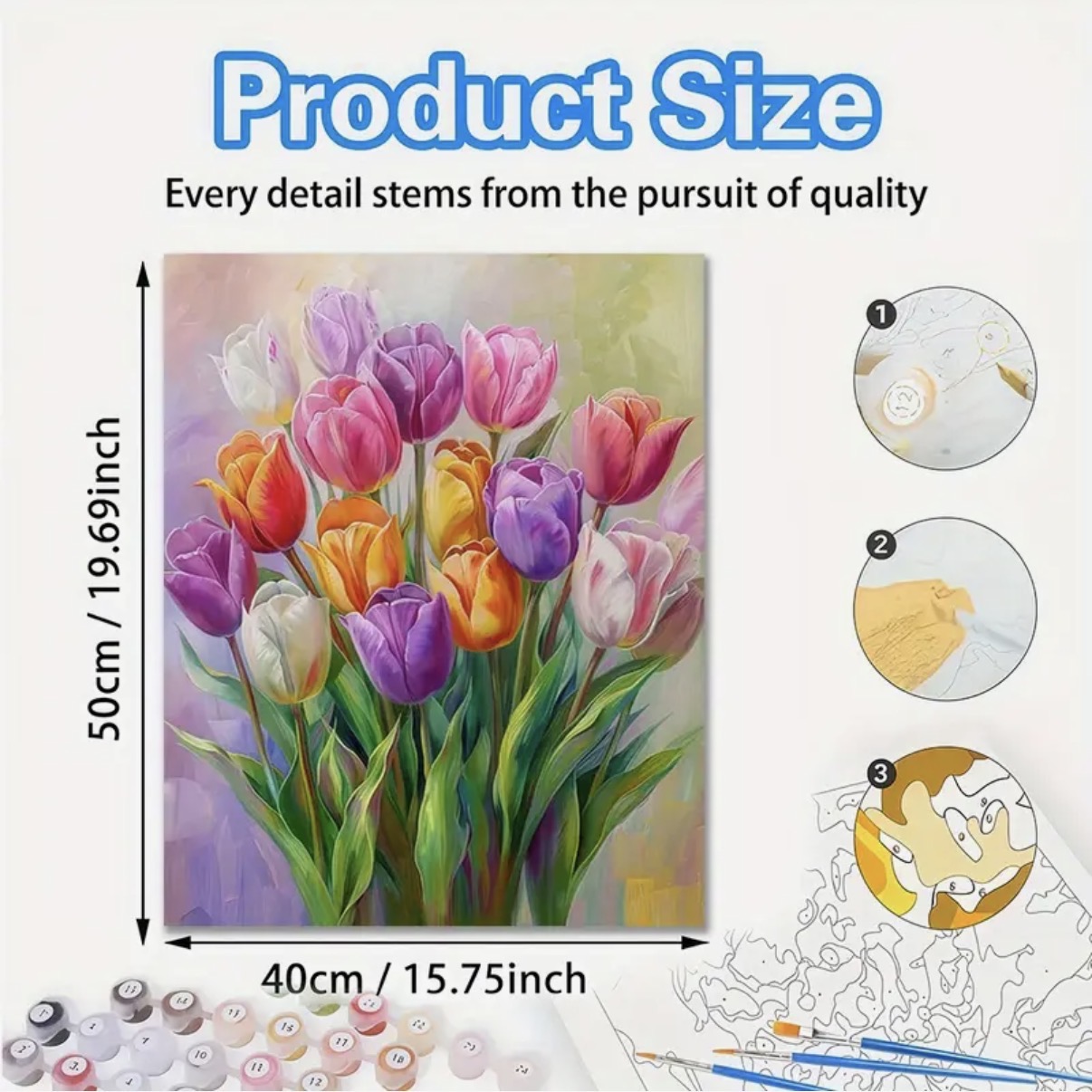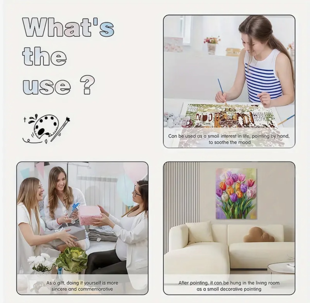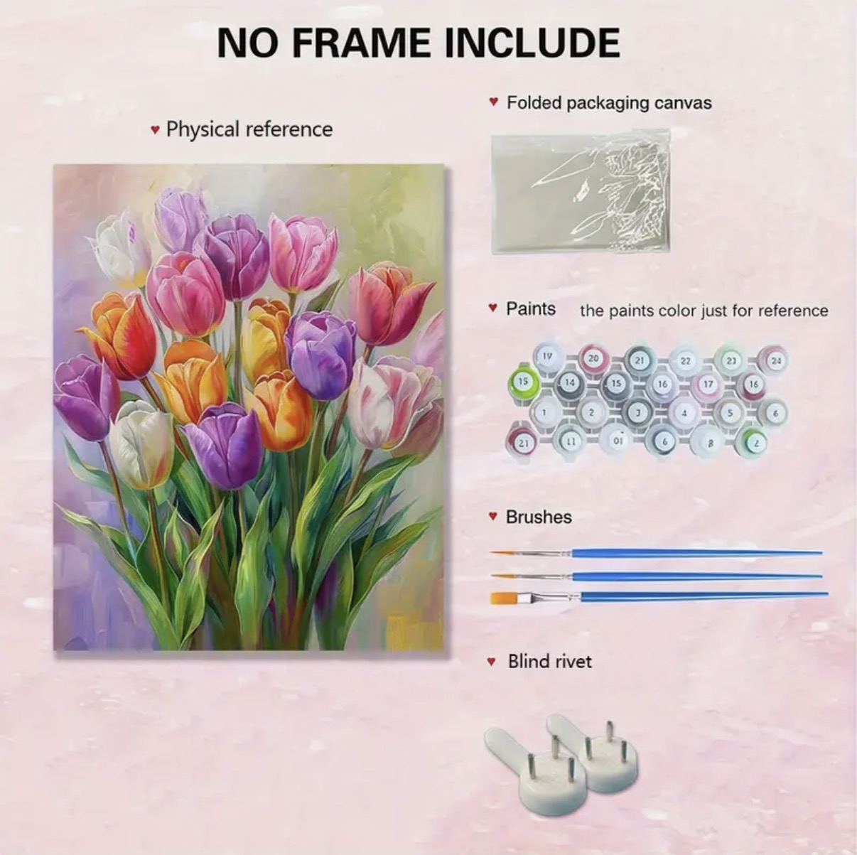 طرح چاپشده با شمارهبندی دقیق، رنگهای اکریلیک باکیفیت، 3عدد قلم مو، گیره و یراق نصب روی دیوار
