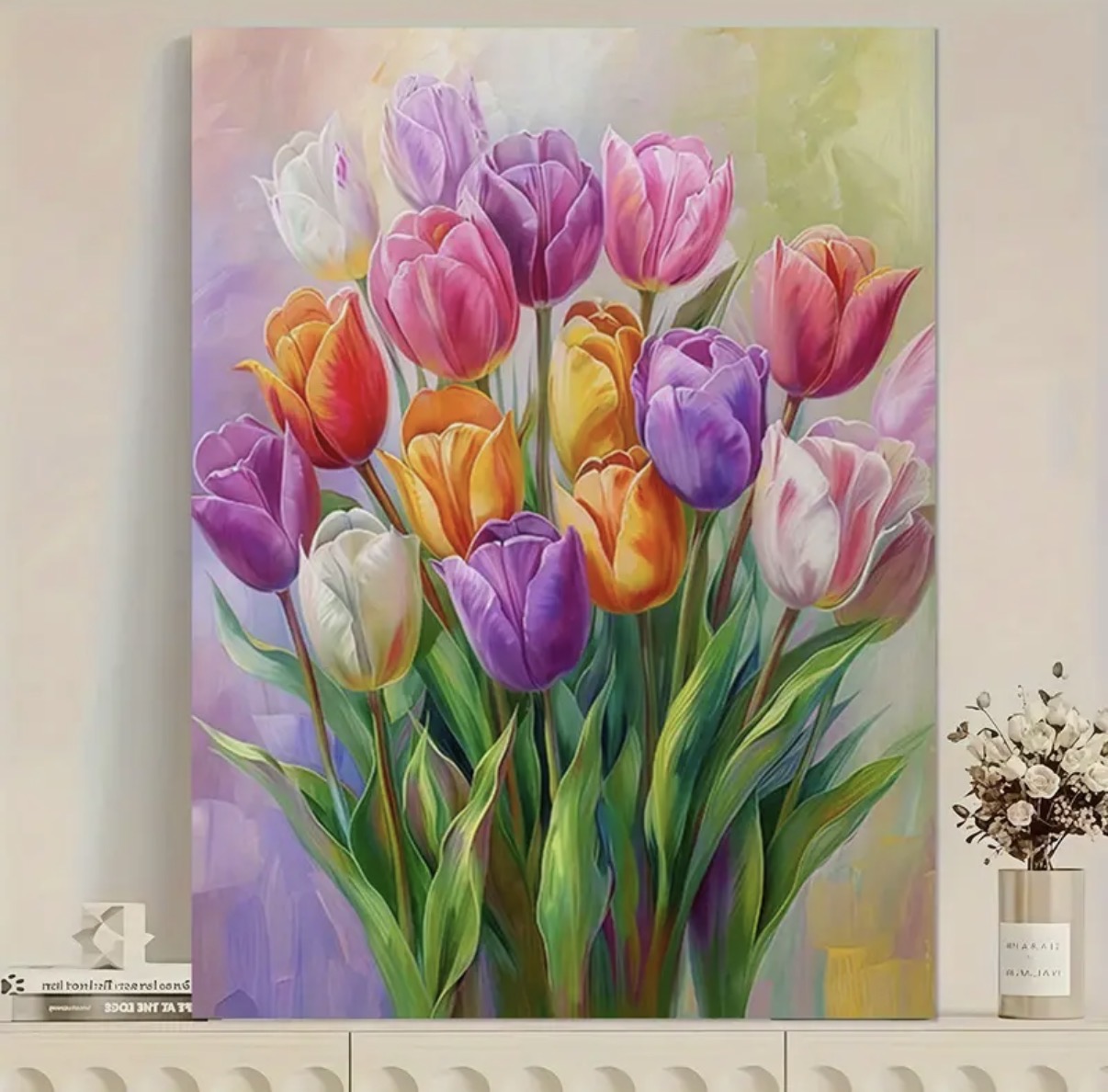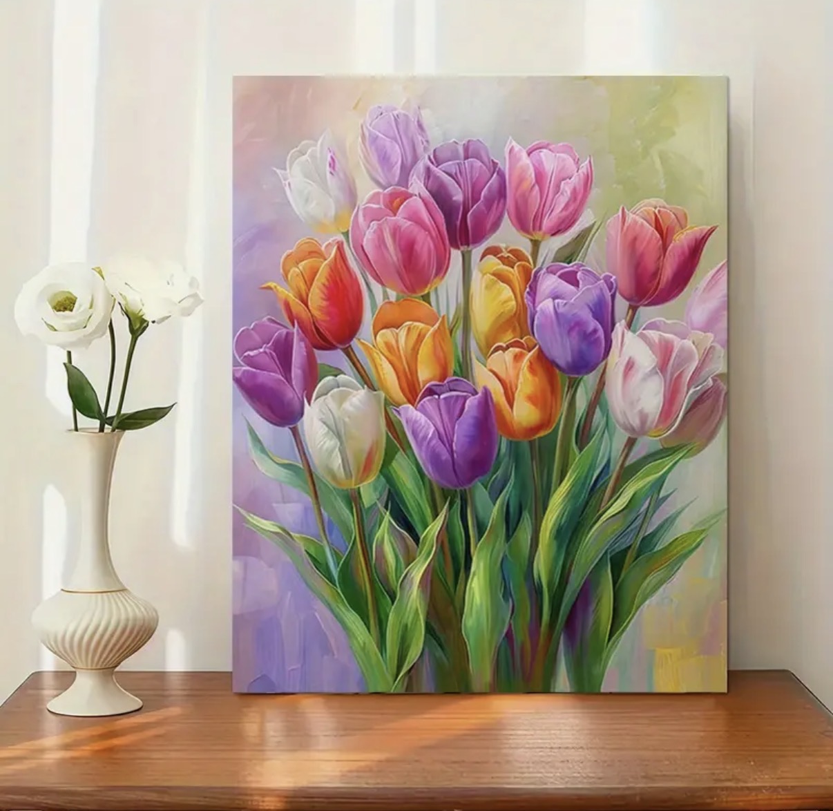 این طرح تصویری لطیف و سرزنده از دستهای لالههای بهاری را نشان میدهد که با ترکیبی هماهنگ از رنگهای صورتی، بنفش، نارنجی، زرد و سفید در کنار هم قرار گرفتهاند. گلها با ساقهها و برگهای سبز زنده، حس طراوت و تازگی طبیعت را بهخوبی منتقل میکنند.