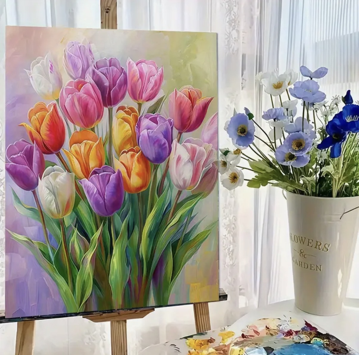 پسزمینهی نقاشی با رنگهای ملایم و محو طراحی شده تا تمرکز اصلی روی گلها باقی بماند و جلوهای آرام، روشن و دلنشین ایجاد شود. ترکیب رنگها شاد اما متعادل است و فضایی گرم و مثبت به تصویر میدهد.