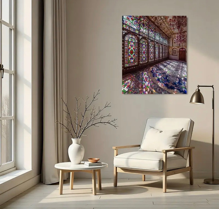 پنجرههای بلند با نقوش هندسی و سنتی در رنگهای قرمز، آبی، سبز و زرد، حس اصالت و هنر معماری ایرانی–شرقی را منتقل میکنند. انعکاس نور روی فرشهای طرحدار، عمق و پویایی خاصی به تصویر داده و باعث میشود فضا زنده و پرتحرک به نظر برسد.
