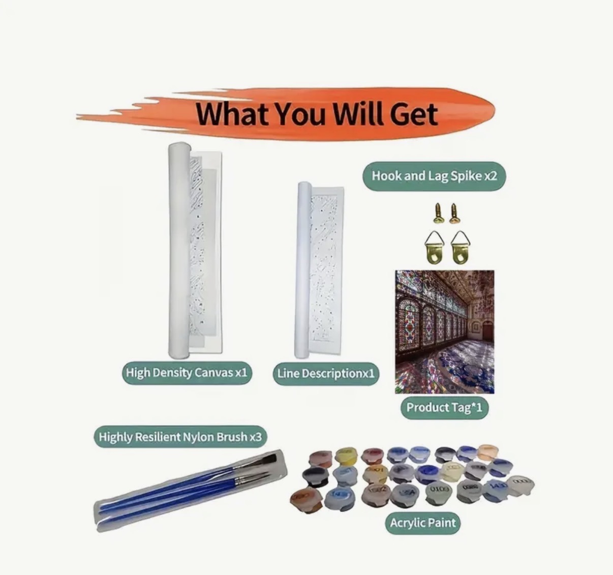 طرح چاپشده با شمارهبندی دقیق، رنگهای اکریلیک باکیفیت، 3عدد قلم مو، گیره و یراق نصب روی دیوار