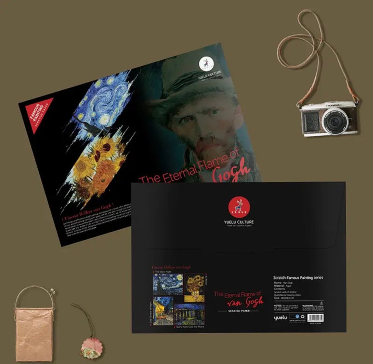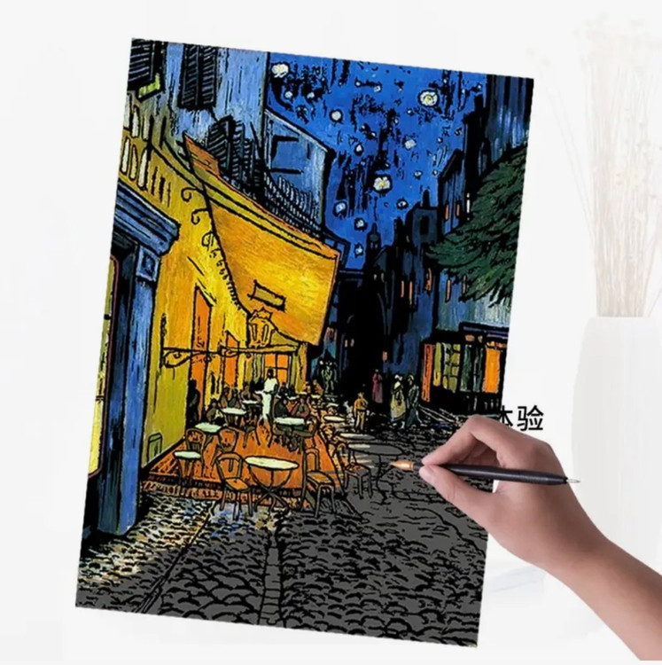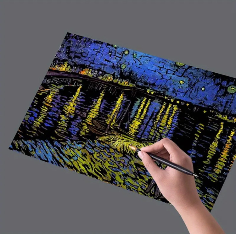 این طرح یک نقاشی خراشیدنی هنری با الهام از آثار معروف ونگوگ است که روی زمینهی مشکی طراحی شده. با خراش دادن سطح مشکی، رنگهای درخشان و خطوط طلایی و رنگی بهتدریج نمایان میشوند و تصویر نهایی شکل میگیرد.
