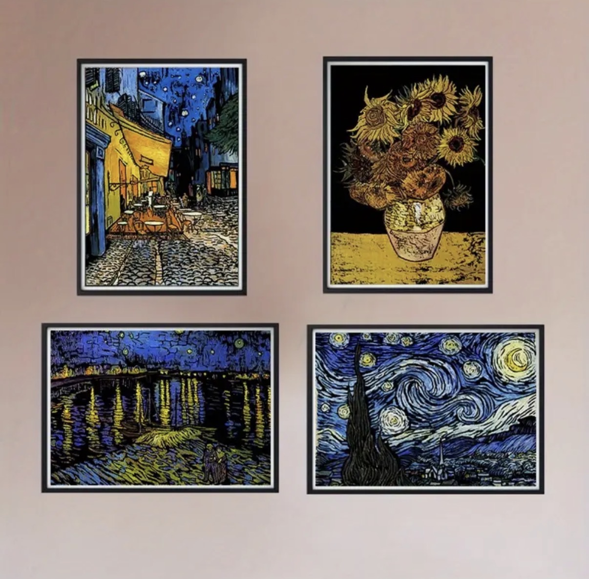 در این مجموعه، صحنههایی مثل شب پرستاره، گلهای آفتابگردان، کافه در شب و منظرهی رودخانه دیده میشود. سبک خطوط موجدار و پرتحرک، کاملاً حس نقاشیهای کلاسیک ونگوگ را منتقل میکند و کنتراست رنگها روی پسزمینهی تیره جلوهای بسیار چشمگیر ایجاد میکند.