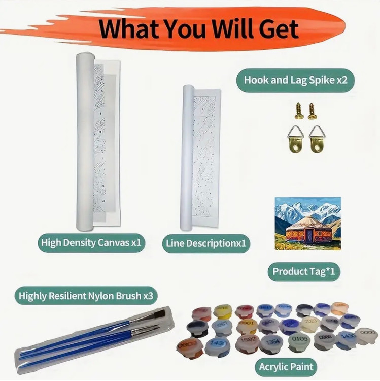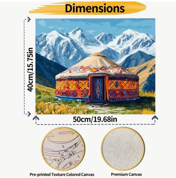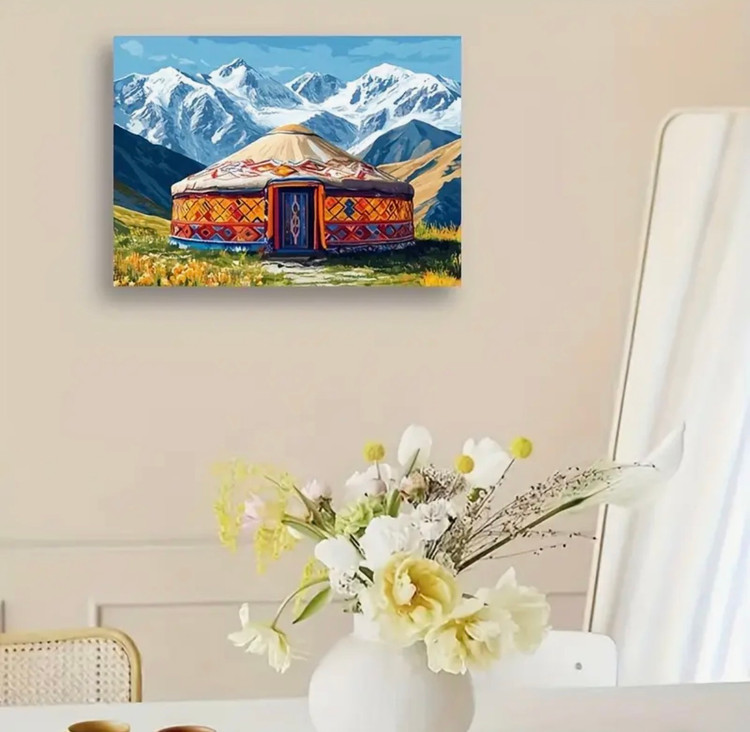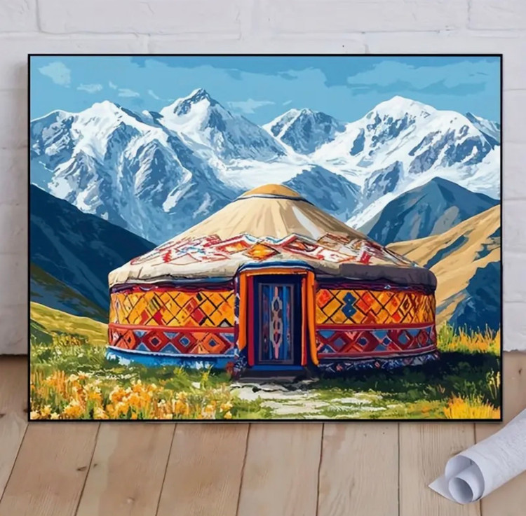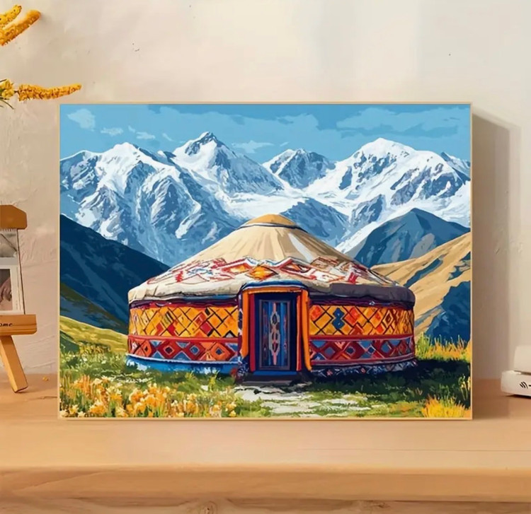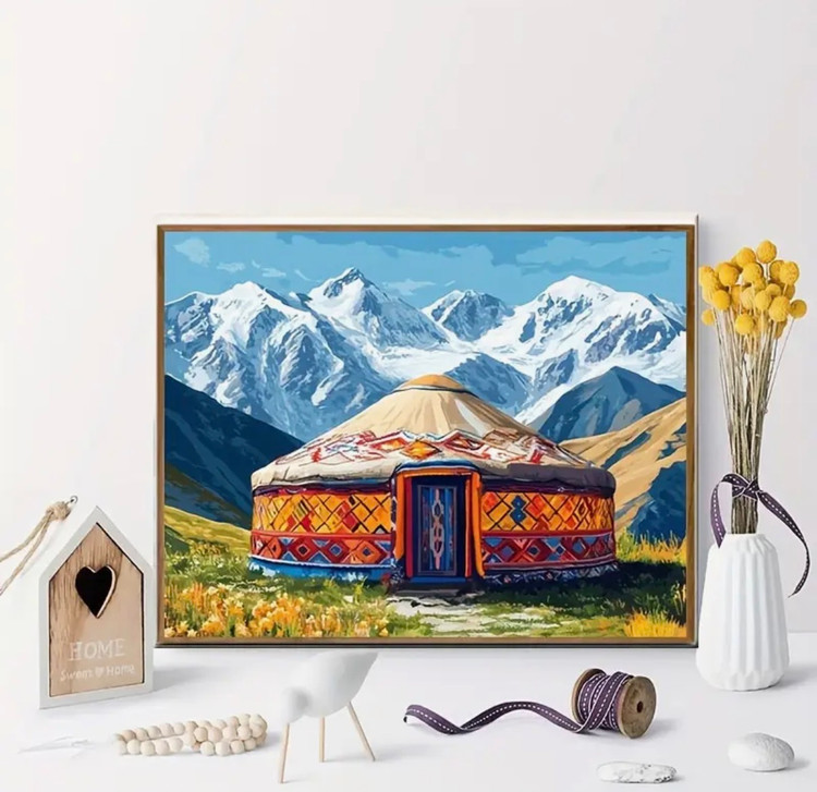این طرح یک نقاشی با اعداد منظرهای و الهامگرفته از فرهنگ بومی است که تصویری از یورت سنتی (چادر عشایری) را در دل طبیعت کوهستانی نشان میدهد. یورت در مرکز تصویر قرار دارد و با نقوش هندسی رنگارنگ تزئین شده که حس اصالت و زندگی سنتی را منتقل میکند.