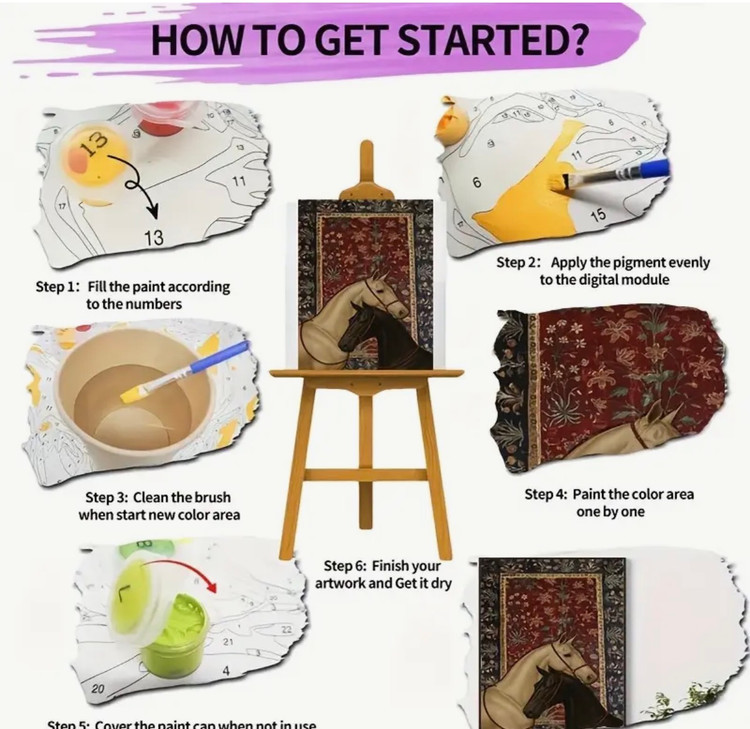 طرح چاپشده با شمارهبندی دقیق، رنگهای اکریلیک باکیفیت، 3عدد قلم مو، گیره و یراق نصب روی دیوار