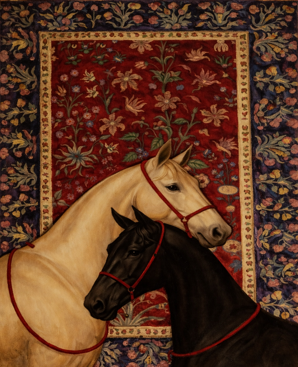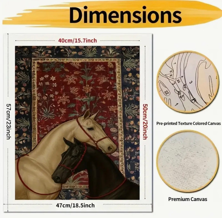این طرح یک نقاشی با اعداد هنری و کلاسیک با موضوع دو اسب نجیب است که حالوهوایی اصیل و اشرافی دارد. ترکیب اسب روشن و تیره در کنار هم، نماد قدرت، آرامش و پیوند را القا میکند و پسزمینهی الهامگرفته از نقوش فرش و پارچههای سنتی، جلوهای گرم و لوکس به اثر میدهد.