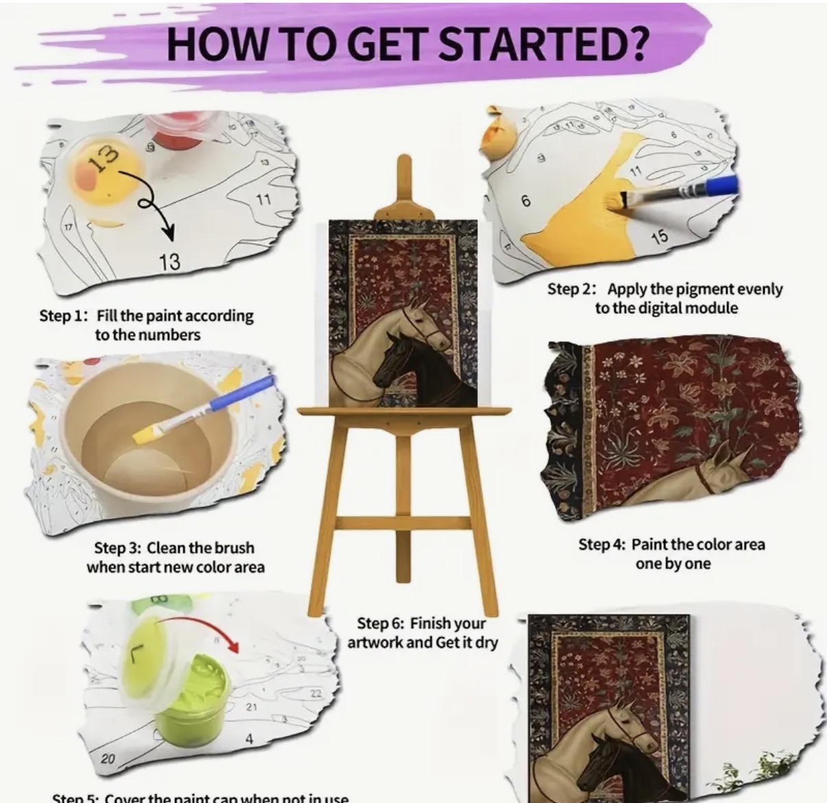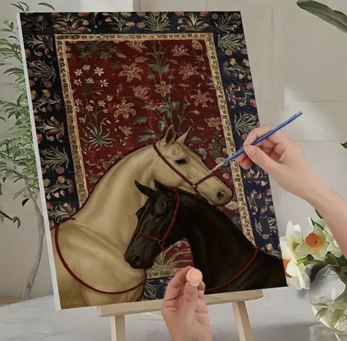 این طرح یک نقاشی با اعداد هنری و کلاسیک با موضوع دو اسب نجیب است که حالوهوایی اصیل و اشرافی دارد. ترکیب اسب روشن و تیره در کنار هم، نماد قدرت، آرامش و پیوند را القا میکند و پسزمینهی الهامگرفته از نقوش فرش و پارچههای سنتی، جلوهای گرم و لوکس به اثر میدهد.