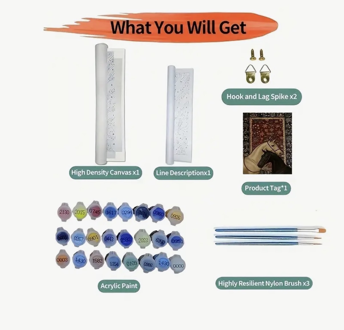 طرح چاپشده با شمارهبندی دقیق، رنگهای اکریلیک باکیفیت، 3عدد قلم مو، گیره و یراق نصب روی دیوار