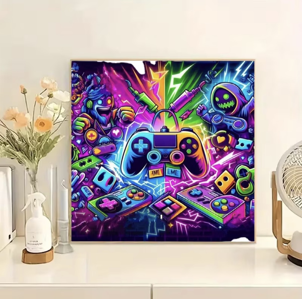 این نقاشی الماسی رولی با فضایی پرانرژی و مدرن، دنیای هیجانانگیز بازیهای ویدیویی را با رنگهایی نئونی و درخشان به تصویر میکشد. در مرکز تصویر، دستهی بازی بهعنوان نماد اصلی دنیای گیمینگ قرار دارد و اطراف آن با المانهایی مانند کنترلرها، آیکونها و شخصیتهای فانتزی پر شده که حس رقابت، هیجان و خلاقیت را القا میکنند.