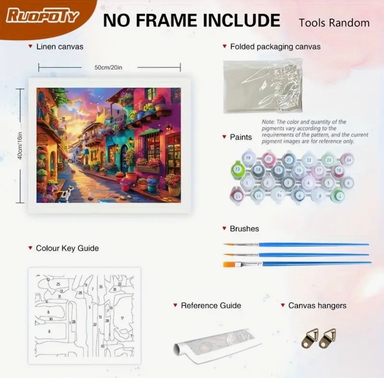 طرح چاپشده با شمارهبندی دقیق، رنگهای اکریلیک باکیفیت، 3عدد قلم مو، گیره و یراق نصب روی دیوار