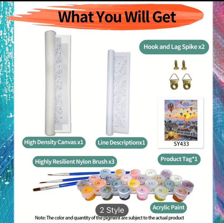 طرح چاپشده با شمارهبندی دقیق، رنگهای اکریلیک باکیفیت، 3عدد قلم مو، گیره و یراق نصب روی دیوار