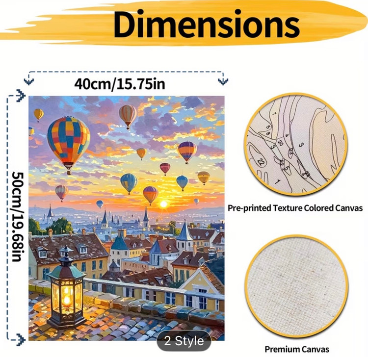 این نقاشی با اعداد (رولی) منظرهای شاعرانه و رویایی از یک شهر قدیمی را در هنگام غروب آفتاب به تصویر میکشد؛ جایی که بالنهای رنگارنگ در آسمانی آمیخته از طلایی، صورتی و آبی آرامآرام شناورند و حس آزادی و خیالپردازی را القا میکنند. بامهای سفالی خانهها، برجها و ساختمانهای کلاسیک شهر، فضایی گرم و نوستالژیک ایجاد کردهاند.