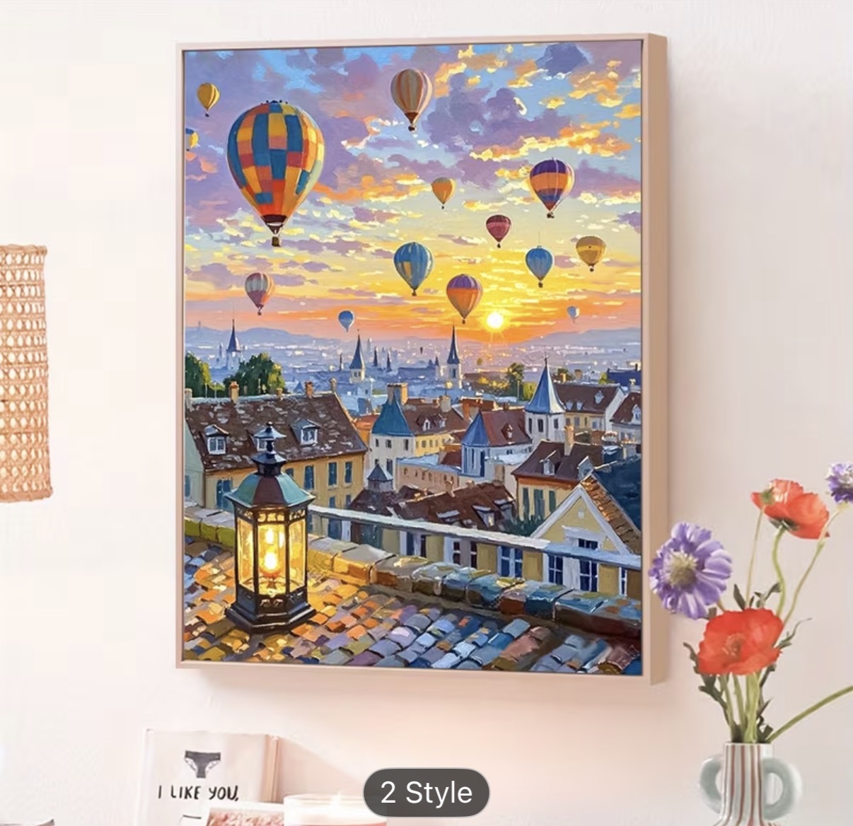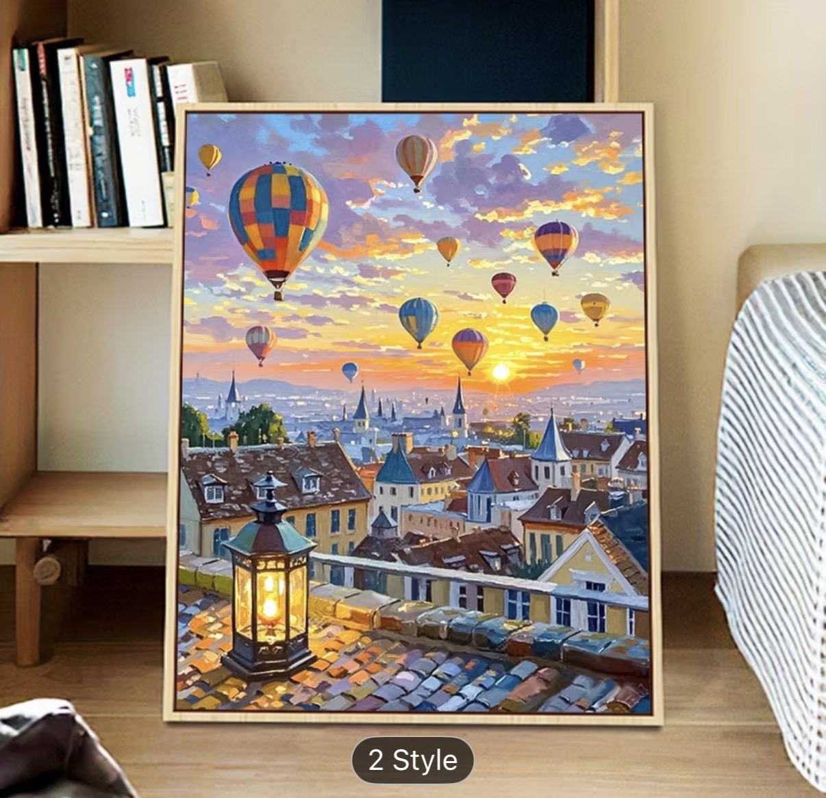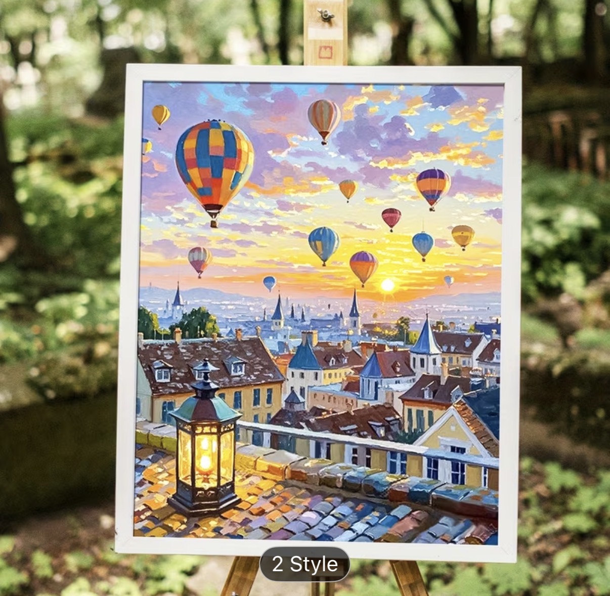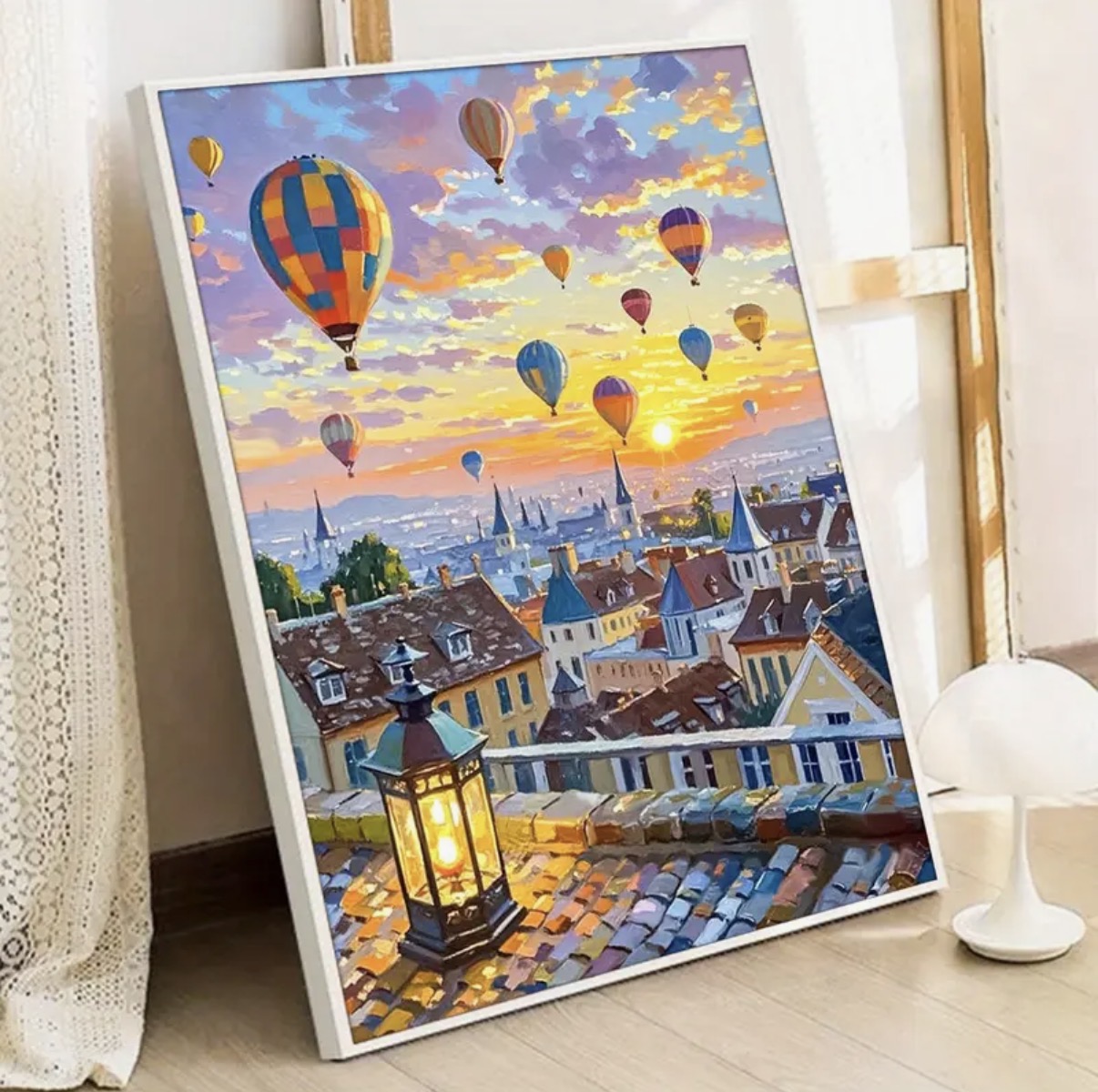 این نقاشی با اعداد (رولی) منظرهای شاعرانه و رویایی از یک شهر قدیمی را در هنگام غروب آفتاب به تصویر میکشد؛ جایی که بالنهای رنگارنگ در آسمانی آمیخته از طلایی، صورتی و آبی آرامآرام شناورند و حس آزادی و خیالپردازی را القا میکنند. بامهای سفالی خانهها، برجها و ساختمانهای کلاسیک شهر، فضایی گرم و نوستالژیک ایجاد کردهاند.