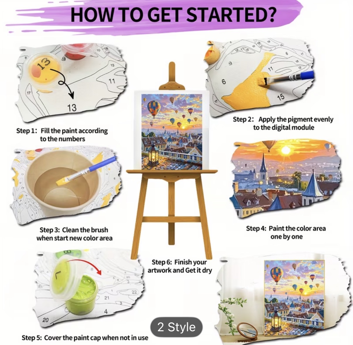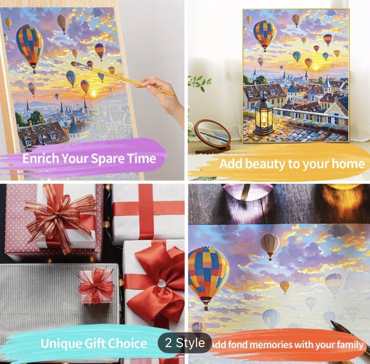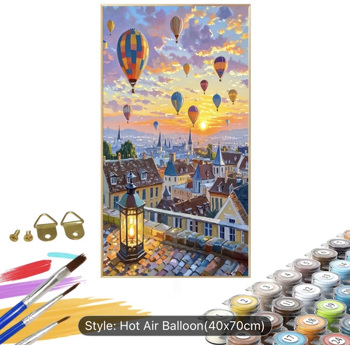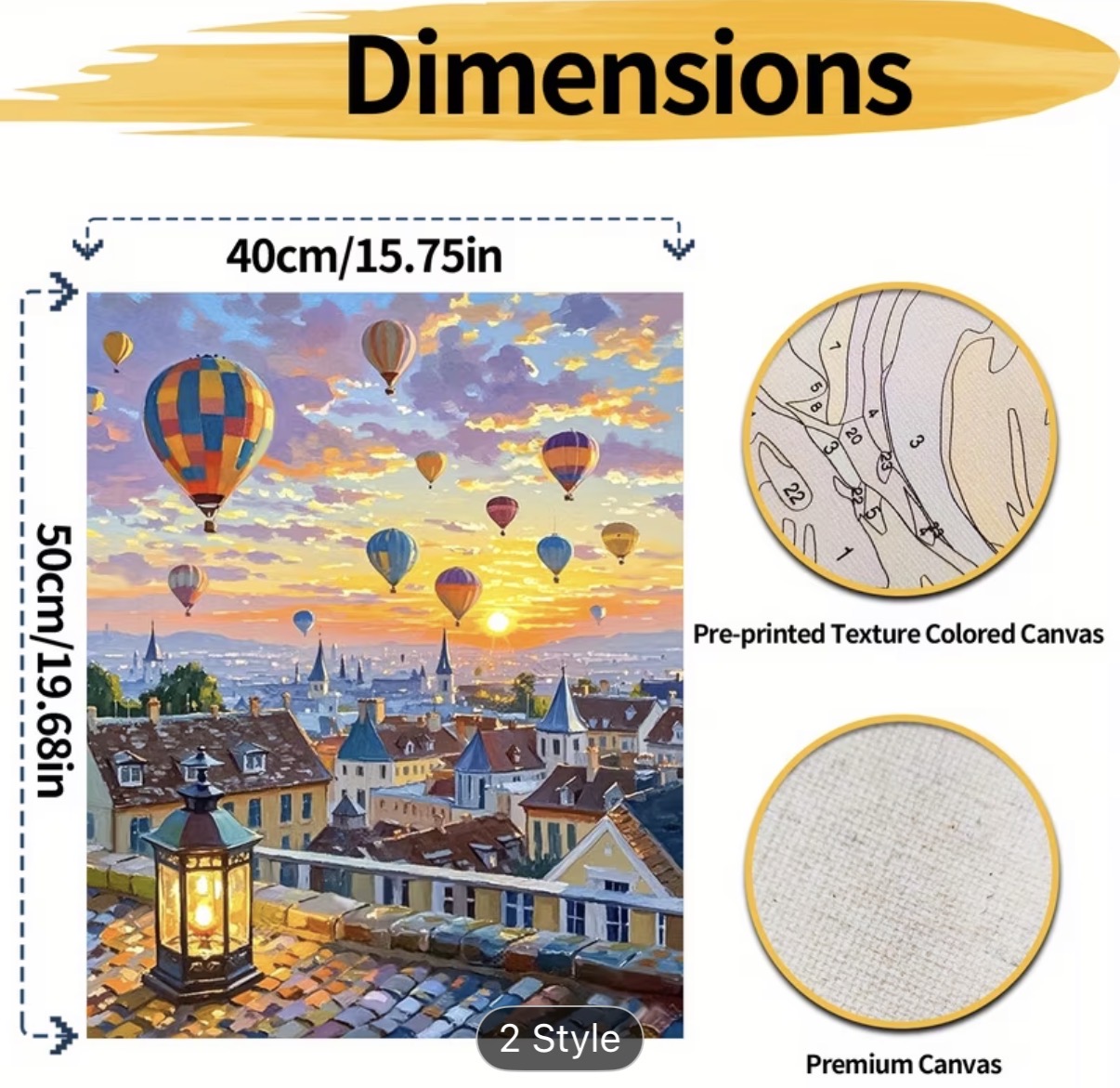 این نقاشی با اعداد (رولی) منظرهای شاعرانه و رویایی از یک شهر قدیمی را در هنگام غروب آفتاب به تصویر میکشد؛ جایی که بالنهای رنگارنگ در آسمانی آمیخته از طلایی، صورتی و آبی آرامآرام شناورند و حس آزادی و خیالپردازی را القا میکنند. بامهای سفالی خانهها، برجها و ساختمانهای کلاسیک شهر، فضایی گرم و نوستالژیک ایجاد کردهاند.