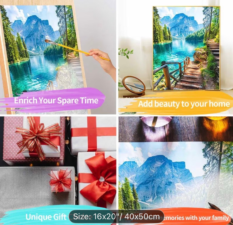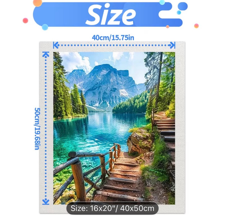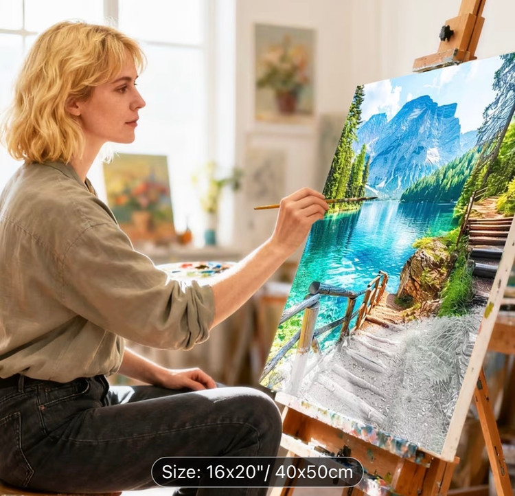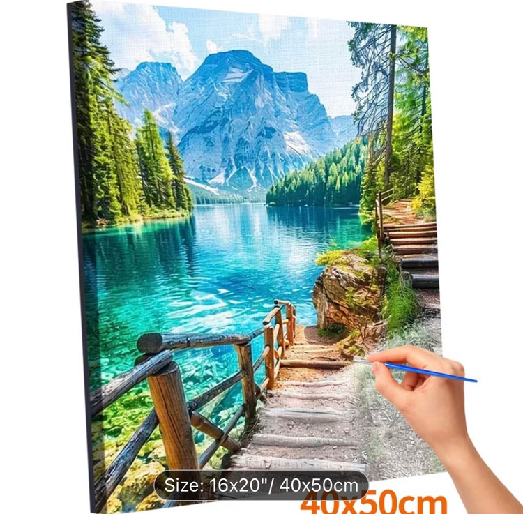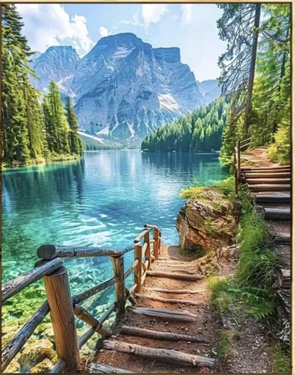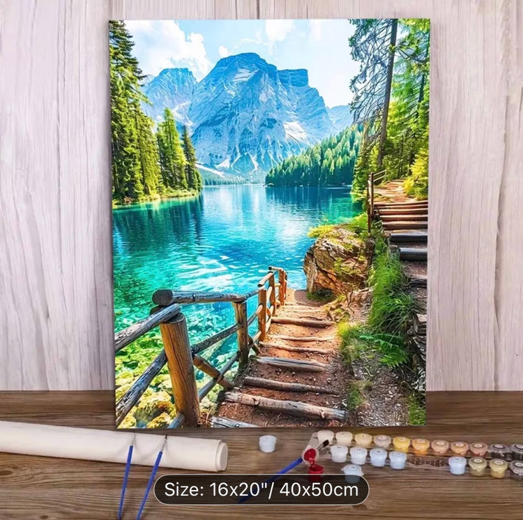 این نقاشی با اعداد (رولی) منظرهای آرامشبخش و الهامگرفته از طبیعت بکر کوهستانی را به تصویر میکشد؛ جایی که دریاچهای زلال با طیفهای فیروزهای و آبی، بازتابی شفاف از کوههای سر به فلک کشیده و جنگلهای انبوه اطراف را در خود جای داده است. مسیر چوبی و پلکان کنار آب، بیننده را به سفری آرام در دل طبیعت دعوت میکند و حس قدمزدن در هوایی پاک و خنک را زنده میسازد.